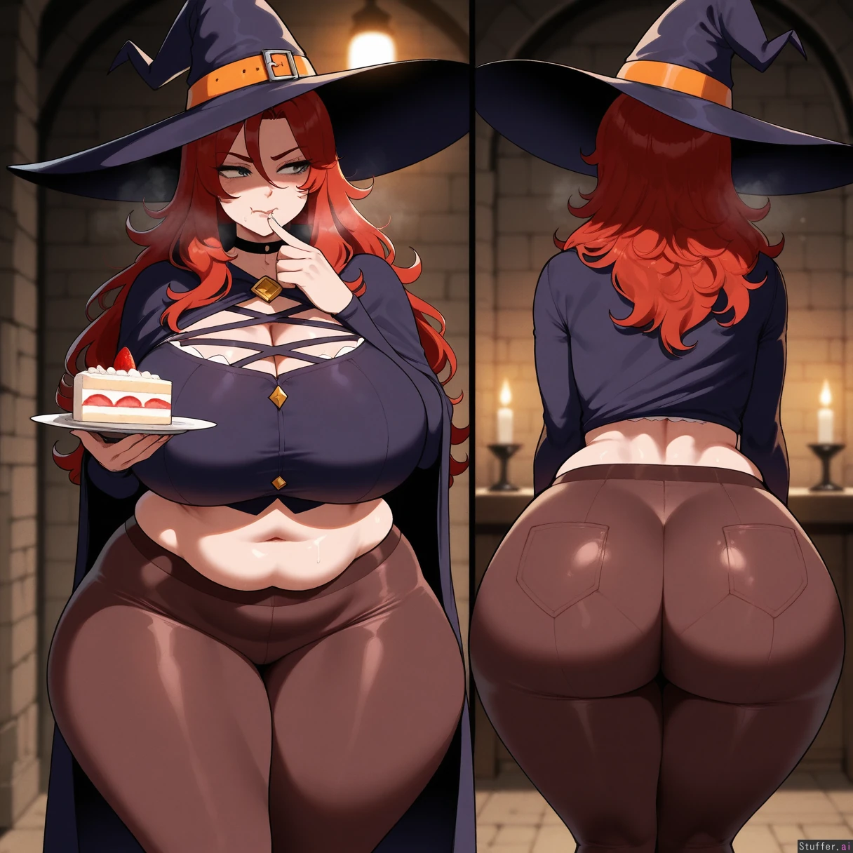 Masterpiece, best_quality, beautiful, vibrant colors, dim light, (1girl), nyantcha(artist), alone, long hair, red hair, green eyes, witch, dungeon, annoyed, eating cake, standing, midriff, brown tights, panting, sweating, out of breath, front view, ((gigantic thighs, wide hips, fat ass, overweight):1.0)