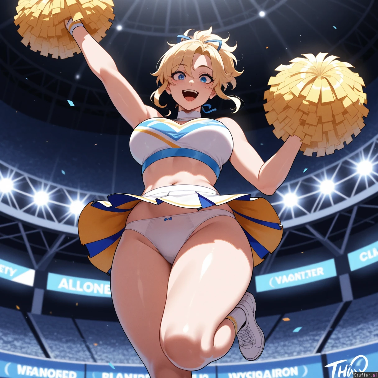 Masterpiece, best_quality, beautiful, vibrant colors, dim light, (1girl), nyantcha(artist), alone, blonde hair, short ponytail, blue eyes, front view, blue cheerleading outfit, midriff, jumping, upskirt, white panties, dynamic pose, excited, stadium, ((gigantic thighs, wide hips, fat ass, overweight):0.5)