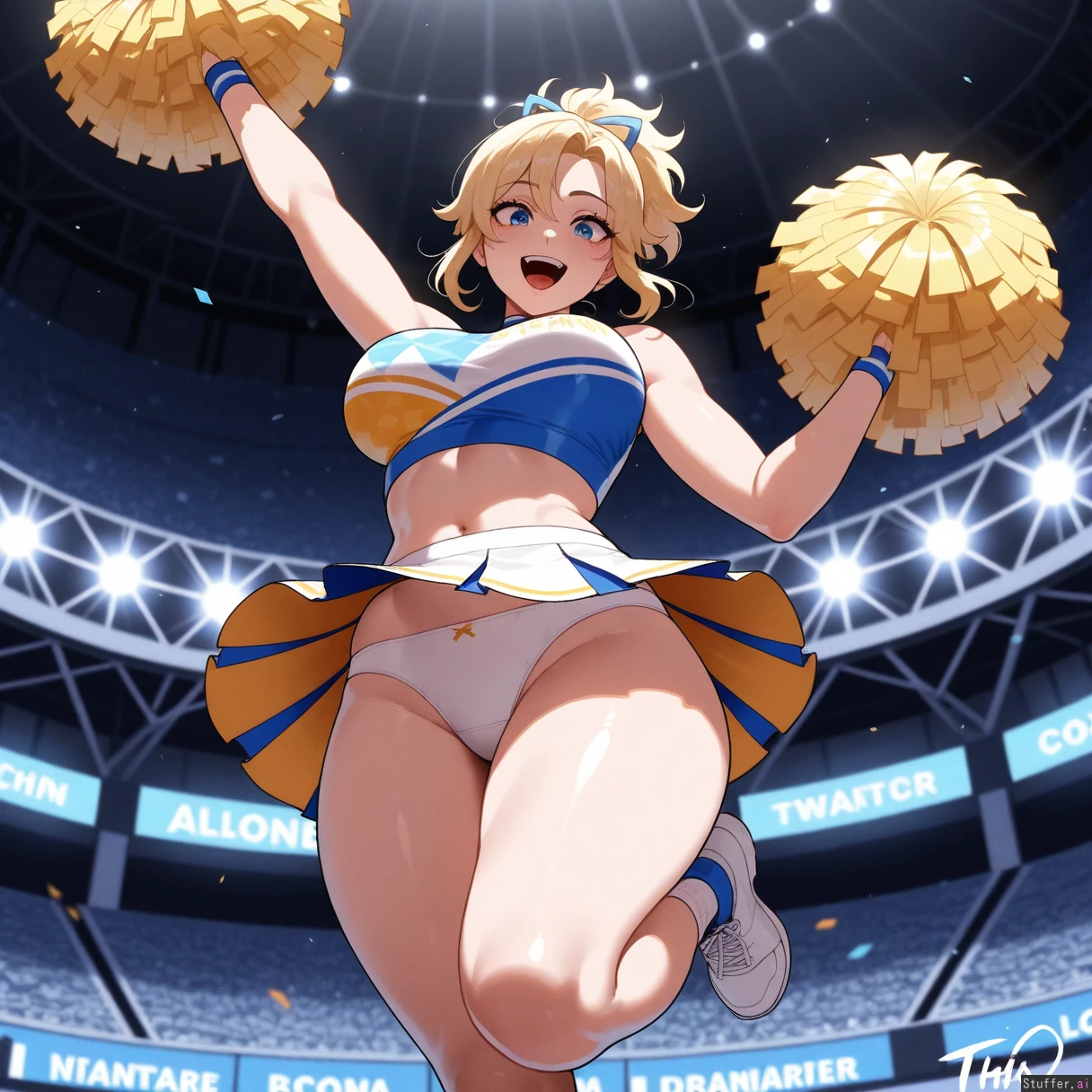 Masterpiece, best_quality, beautiful, vibrant colors, dim light, (1girl), nyantcha(artist), alone, blonde hair, short ponytail, blue eyes, front view, blue cheerleading outfit, midriff, jumping, upskirt, white panties, dynamic pose, excited, stadium, ((gigantic thighs, wide hips, fat ass, overweight):0.6)