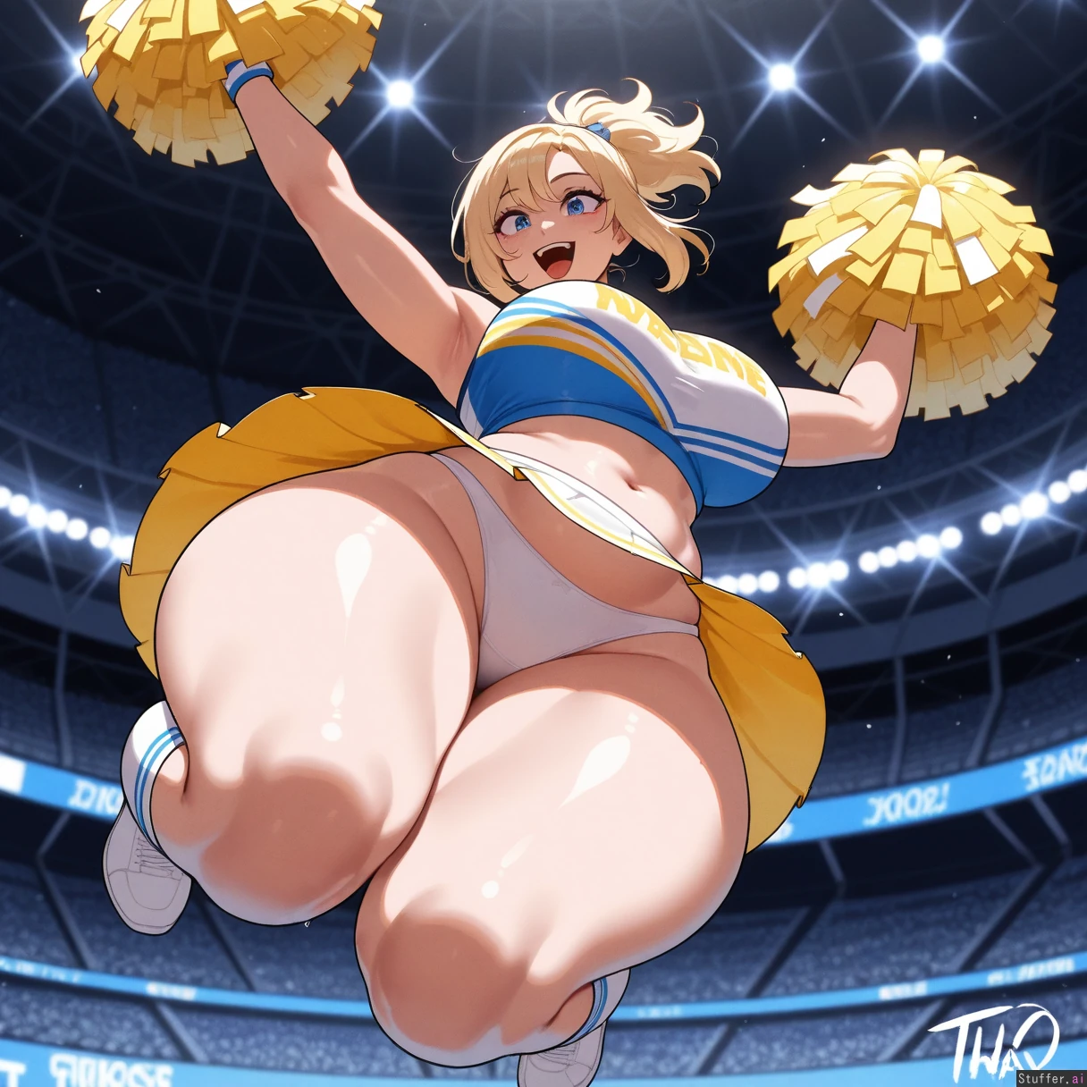 Masterpiece, best_quality, beautiful, vibrant colors, dim light, (1girl), nyantcha(artist), alone, blonde hair, short ponytail, blue eyes, front view, blue cheerleading outfit, midriff, jumping, upskirt, white panties, dynamic pose, excited, stadium, (gigantic thighs, wide hips, fat ass), (overweight:1.0)