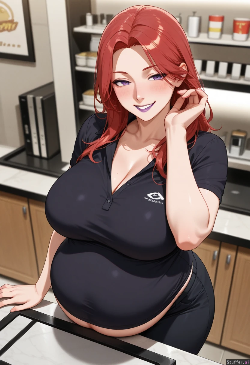((exquisite quality), (extremely detailed), (realistic anime style), (masterpiece), (skin detail, skin folds, detailed realistic body, detailed realistic face), (1 girl, solo), (front view from across the countertop)). A waitress at the fast-food restaurant, (working the till), (standing on the other side of the countertop)). (Beautiful red hair). ((Beautiful purple eyes), (almond-shaped eyes), (half-closed eyes), (seductive eyes)). ((Magnificent attractive face), (flirting, flirtatious expression), (aquiline nose), (seductive grin), (blushing), (make-up, purple lips, purple eyeshadow)). (Wearing a straining skin-tight black polo, (cleavage), (polo type t-shirt), (fabric straining), wearing black pants). ((Touching her hair), standing upright). (22 years old, adult, mature. (Chubby), (huge belly bulge), (disproportionate belly), (hyper belly:1.1), (belly peek)). (Fat belly fetishism, weight gain fetishism, weight gain kink, fat belly kink).