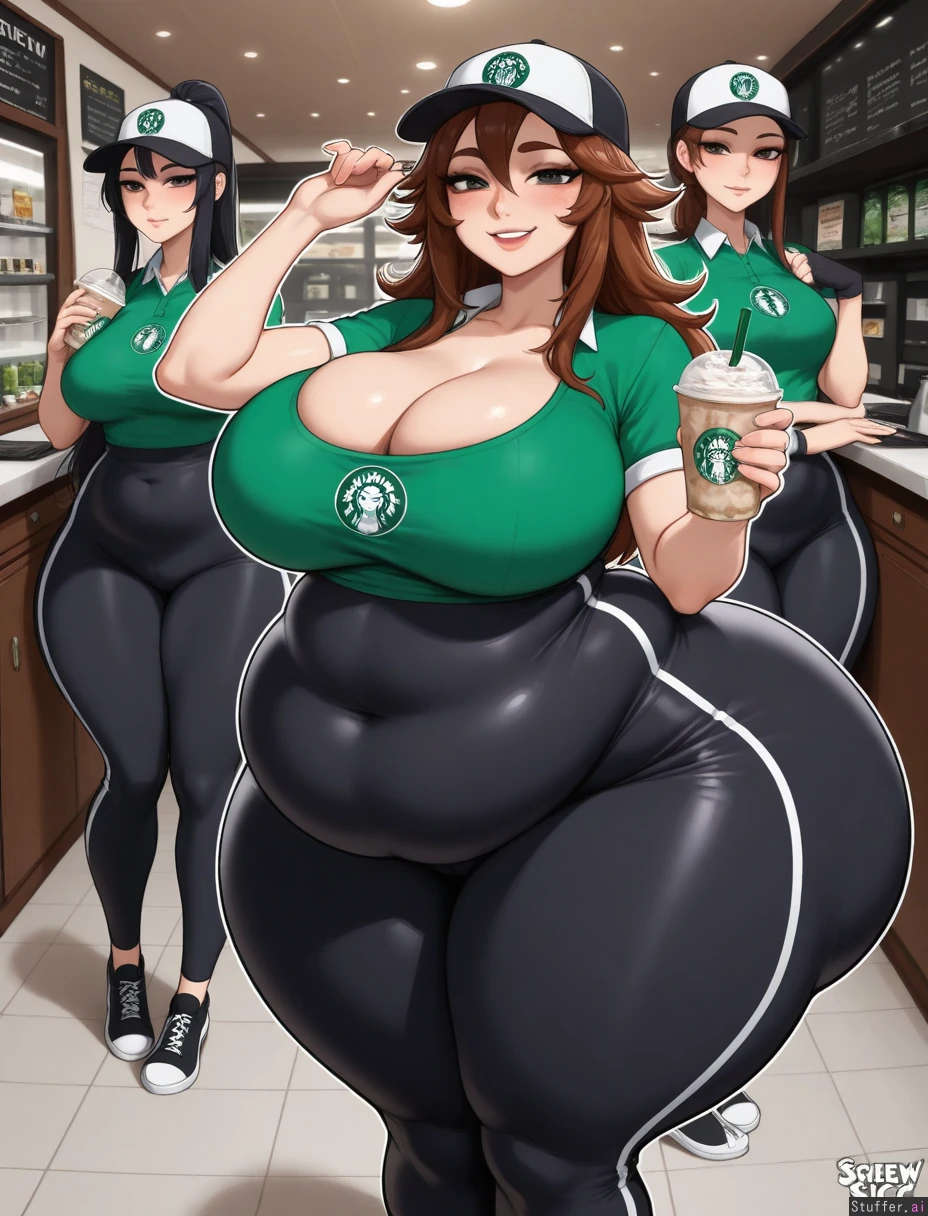 (exquisite quality, extremely detailed, realistic style, masterpiece, absurdres, solo, one girl, torso view). An attractive British Starbucks barista working at the till. Wearing a skin-tight green polo t-shirt. Deep Cleavage. Open collar. Starbucks cap. Fabric straining. Wearing black pants. (Starbucks employee outfit). Beautiful long dark-brown hair. Beautiful deep blue eyes. Cute snub nose. Smiling, happy, good vibes. 28 years old. (Chubby, round prominent belly bulge), (Fat belly fetishism, weight gain fetishism, weight gain kink, fat belly kink), (Super-full spherical inflated-belly:1.4, super belly-blush, hyper-belly:1.4, gigantic belly:1.4, huge lower-belly:1.4, huge fat fupa:1.4, perky belly), (gigantic fat ass:1.4), (gigantic ass-fat:1.4), (wide waist, (extra-thick-thighs:1.4), (bottomheavy:1.4), (Thick curves:1.4, soft body:1.4), (Hyper-feminine curves:1.4, hyper-feminine super-soft body:1.4), c.cu(artist), kittew(artist), prywinko(artist), spellsx(artist), ohshinakai(artist), doveymouse(artist), Ninjart1st(artist), c.cu\(artist\):1.3), (blushyspicy\(artist\):1.2), (kipteitei\(artist\):1.2), (spellsX\(artist\):1.3), (Kittew\(artist\):1.3), (ohshinakai\(artist\):1.2), (doveymouse\(artist\):1.3), (Ninjart1st\(artist\):1.2), (Jellybelly\(artist\):1.3), (troat301186\(artist\):1.2), (toraraz\(artist\):1.3), ((highest resolution and clarity)), (perfect human anatomy), (high image clarity, sharp image focus), (4k_UHD, highly detailed, highest rating, high resolution, masterpiece quality, realistic expressions, intricate texture detail, dynamic lighting), detailed face, best quality, masterpiece, (plump:1.5), (thick), (fat:1.2), massive belly, ((Ultra HD), (perfect lighting), realism), HDR, best quality, masterpiece, hyper detail, (wide view:1.4, one view, single scene), Absurdres, 8k, perfect anatomy, masterpiece, beautiful face, beautiful eyes, (RockSolidArt), (merunyaa), (usa37107692), (ohasi_art), (betterwithsalt), (nyantcha), (krekkov), (reiq), (kittew), (yanje), hdr, c.cu:1.2, blushyspicy:1.4, prywinko:1.4, betterwithsalt:1.2, icarusillustrations:1.4, Icarusillustrations:1.2, kittew:1.2, (spellsX\(artist\):1.3), (Coffeeslice\(artist\):1.3), (ohshinakai\(artist\):1.2), (doveymouse\(artist\):1.3), (((Super-lewd body:1.4))), (flat colors). ((white cutline-outline):1.3). masterful comic-book shading. masterpiece drawing. well-drawn lines. simple detailed eyes. pupils. gorgeous hair. beautiful woman. kipteitei. pewbutt. betterwithsalt