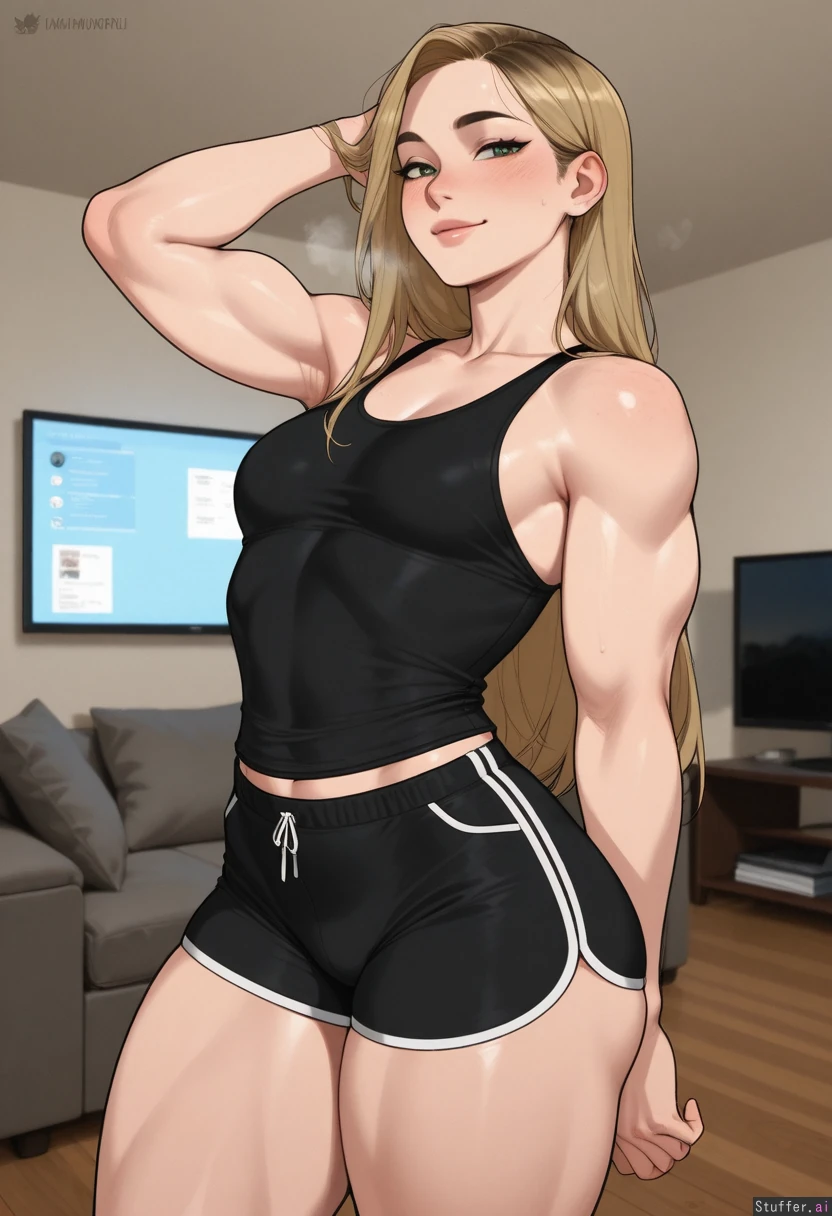 masterpiece, best quality, score_7. krekkov(artists), KAMII MOMORU(artist), beautiful shading, highly detailed, best quality, perfect anatomy, perfect proportions, perfect lighting, (pretty milf, mature), stunning beauty, solo ((Dark blonde hair)), (straight long hair on shoulder), thin lips, defined jawline, small squinting green eyes, ((love gaze)), blushing, ((Black tank top, black shorts)), Living room with windows, neutral expression, small smile, steaming breath, , skindentation, strong physique, thick, muscular, (Small breasts), (Strong muscular arms) (Wide back) (Strong big muscular legs) (Thick waist) (wide hips) ((Side view))