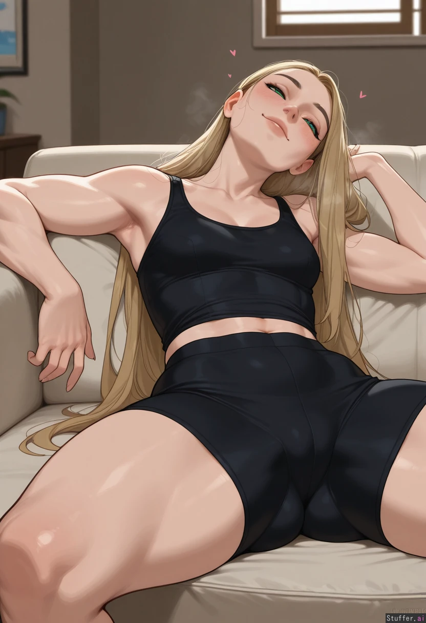 masterpiece, best quality, score_7. krekkov(artists), KAMII MOMORU(artist), beautiful shading, highly detailed, best quality, perfect anatomy, perfect proportions, perfect lighting, (pretty milf, mature), stunning beauty, solo ((Dark blonde hair)), (straight long hair on shoulder), thin lips, defined jawline, small squinting green eyes, ((love gaze)), blushing, ((Black tank top, black shorts)), Living room with windows, neutral expression, small smile, steaming breath, relaxing on couch, legs spread, head back , skindentation, strong physique, thick, muscular, (bloated), massive body, (Small breasts), (Strong big muscular arms) (Wide back) (Strong big muscular legs) (Thick waist) (wide hips) (Big ass) ((Side view))
