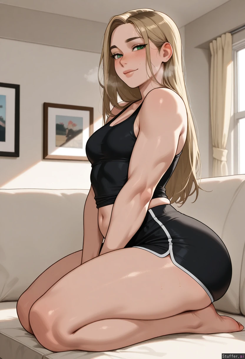 masterpiece, best quality, score_7. krekkov(artists), KAMII MOMORU(artist), beautiful shading, highly detailed, best quality, perfect anatomy, perfect proportions, perfect lighting, (pretty milf, mature), stunning beauty, solo ((Dark blonde hair)), (straight long hair on shoulder), thin lips, defined jawline, small squinting green eyes, ((love gaze)), blushing, ((Black tank top, black shorts)), Living room with windows, neutral expression, small smile, steaming breath, kneeling on couch, legs spread, , skindentation, strong physique, thick, muscular, (bloated), massive body, (Small breasts), (Strong big muscular arms) (Wide back) (Strong big muscular legs) (Thick waist) (wide hips) (Big ass) ((Side view))