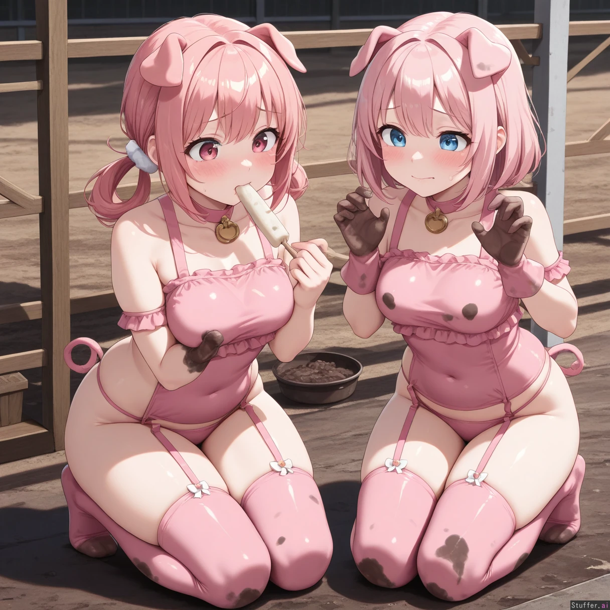 2 women, masterpiece, farm, mud, outside, **Woman 1** (pink pig outfit, pink garter straps, woman, pink hair, short hair, piggy tails, blue eyes, blushing, (((medium breasts:1.4))), (((chubby:0.4))), (((hips:1.2))), (((thighs:1.2))), (((orgasm face:0.0))),) **Woman 2** (pink pig outfit, pink garter straps, pink hair, long hair, pink eyes, blushing, on floor, on knees, eating from food trough,