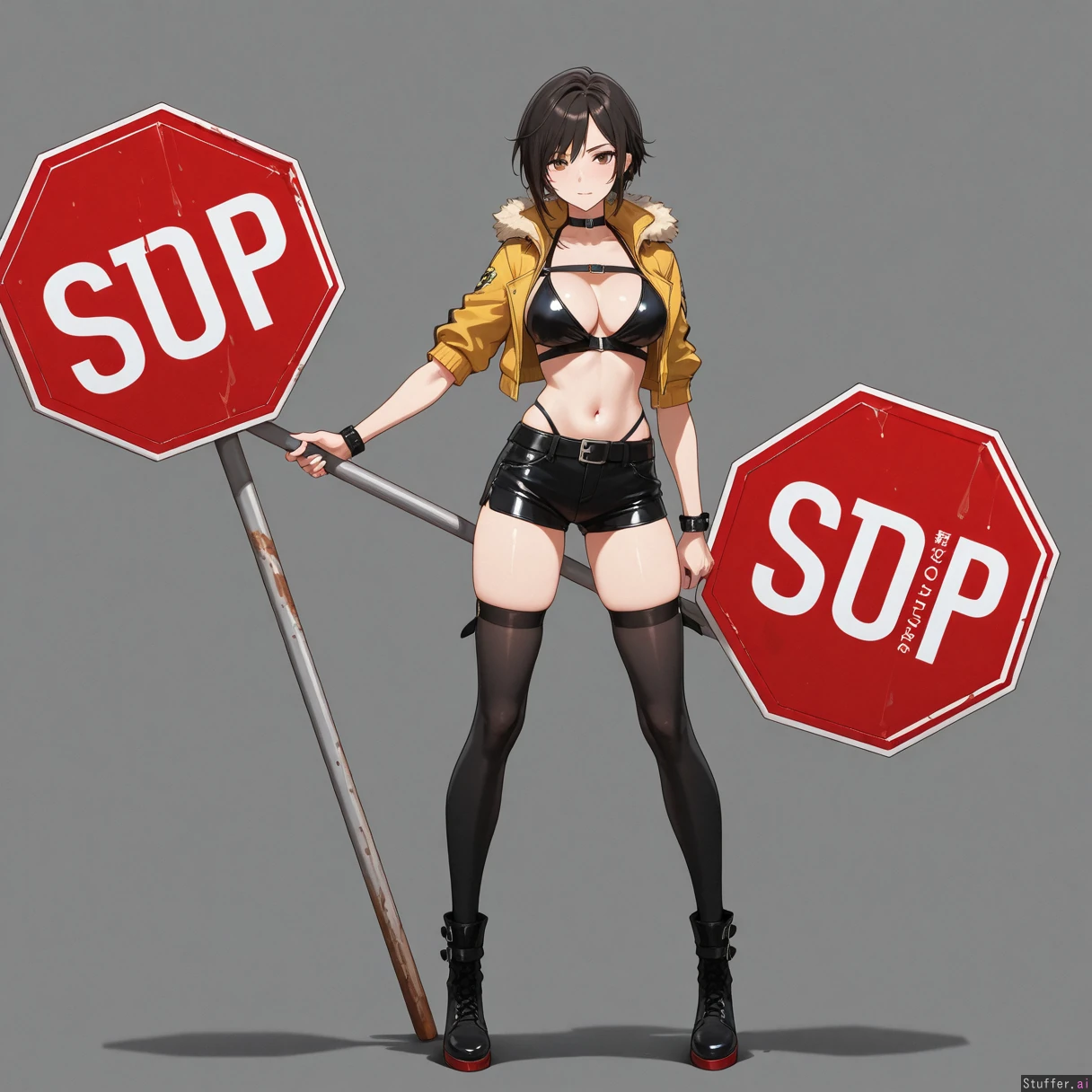 woman holding big stop sign