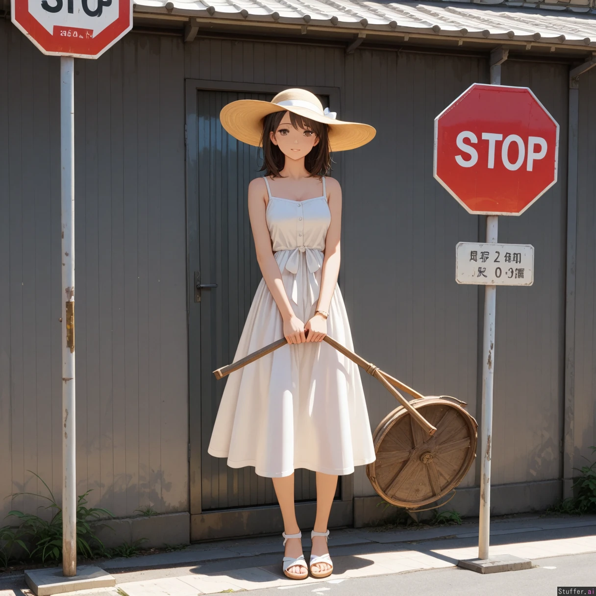 woman in sun dress holding big STOP sign