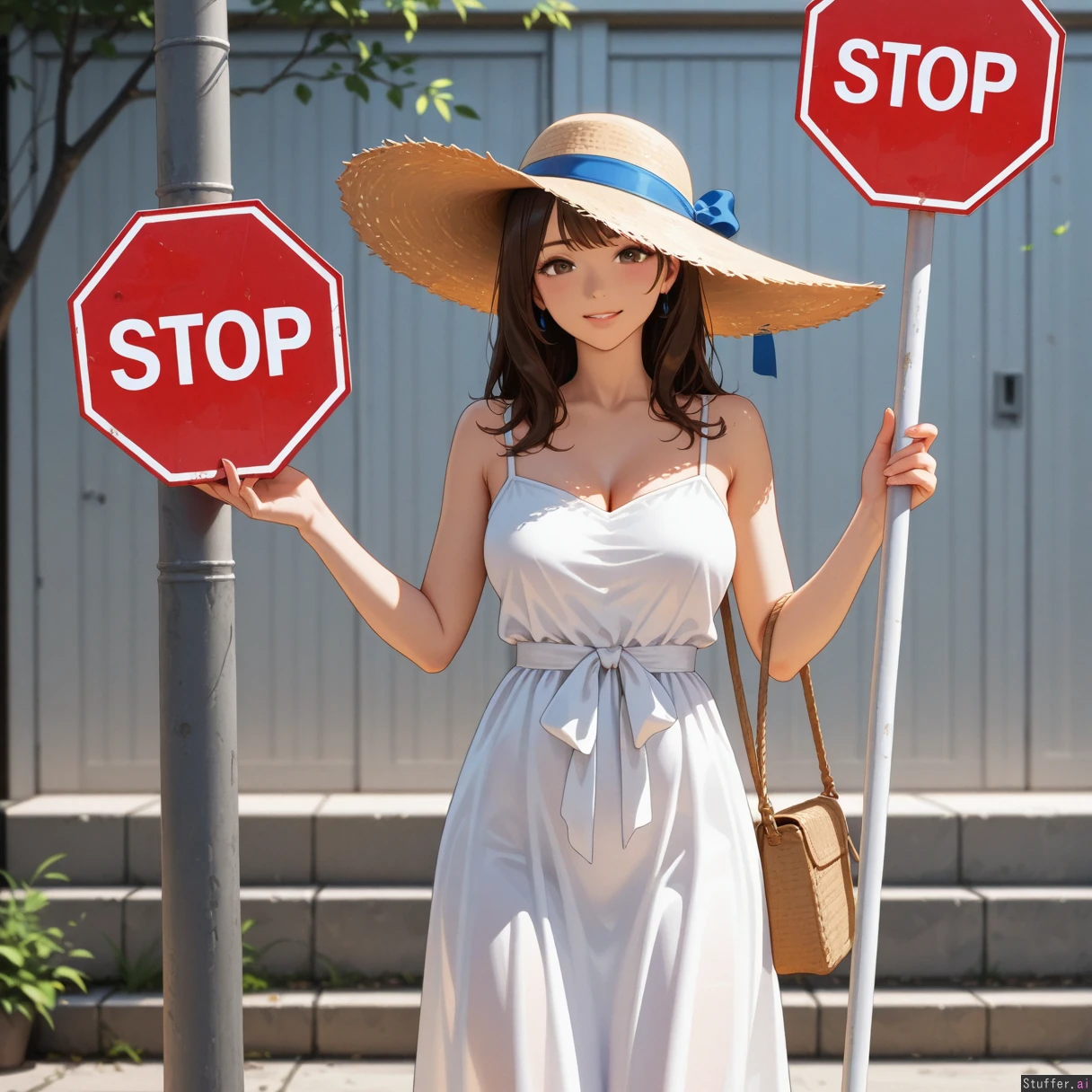 woman in sun dress holding big STOP sign