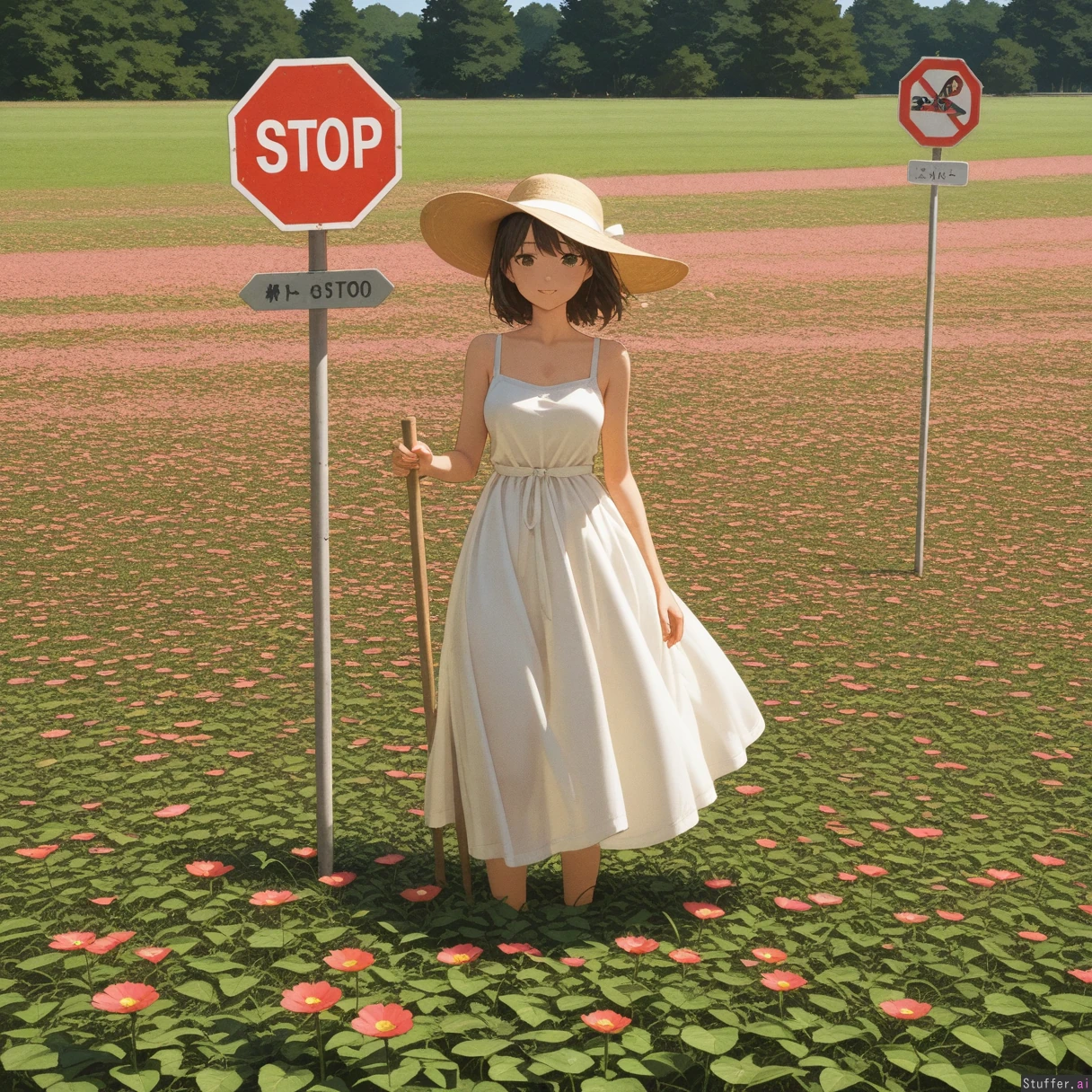 woman in sun dress holding big STOP sign, in open field of flowers