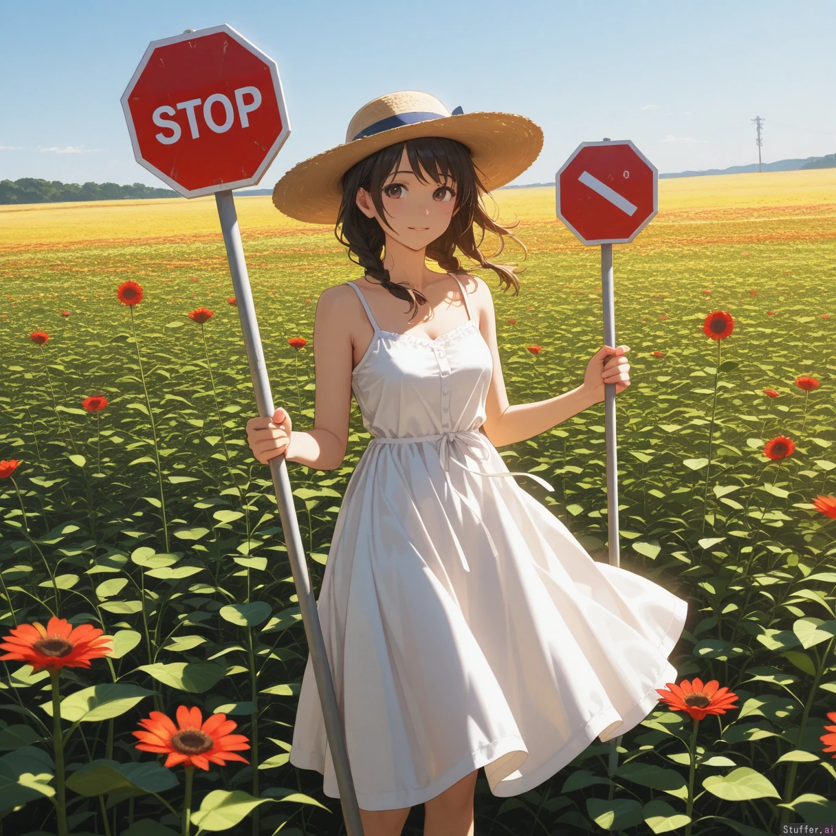 woman, sun dress, holding big STOP sign, in field of flowers
