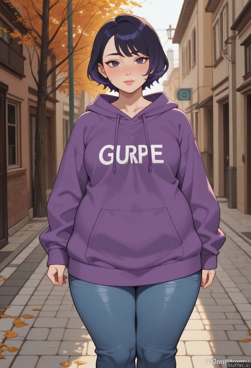 hdr, (high quality), pewbutt(artist), (KAMII MOMORU(artist), masterpiece, beautiful shading, (detailed eyes) 1girl, (attractive), adult, adult, dyed hair, dark purple hair, short hair, purple eyes, ((shy)), (nervous), ((blush)), small breasts, walking, looking at viewer Oversized hoodie, jeans (Chubby), fat arms, fat legs Street, europe, autumn