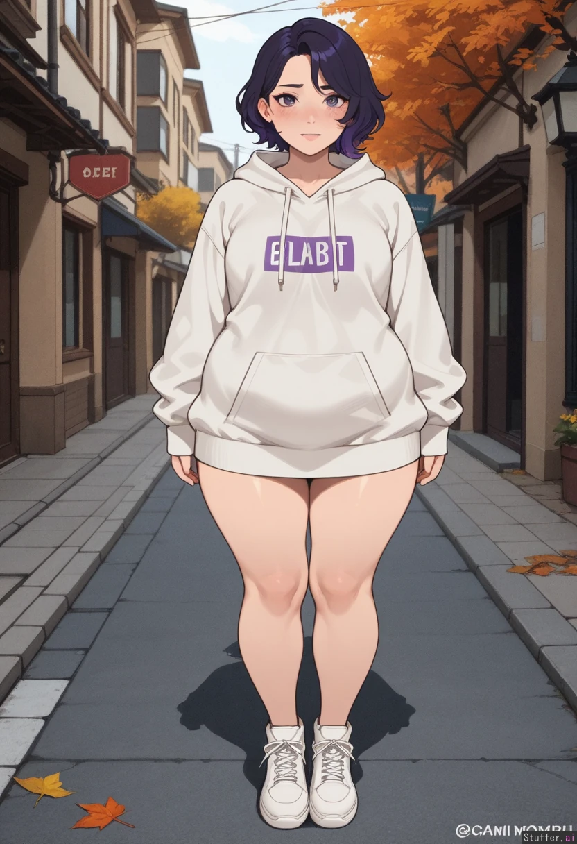 hdr, (high quality), pewbutt(artist), (KAMII MOMORU(artist), masterpiece, beautiful shading, (detailed eyes) 1girl, (attractive), adult, adult, dyed hair, dark purple hair, short hair, purple eyes, ((shy)), (nervous), ((blush)), small breasts, looking at viewer Oversized hoodie (Chubby), fat arms, fat legs, (round face) Street, europe, autumn