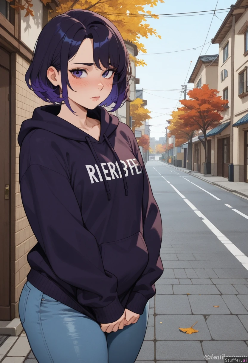 hdr, (high quality), pewbutt(artist), (KAMII MOMORU(artist), masterpiece, beautiful shading, (detailed eyes) 1girl, (attractive), adult, adult, dyed hair, dark purple hair, short hair, purple eyes, shy, (nervous), ((blush)), small breasts, looking at viewer Oversized hoodie, jeans (Chubby), fat arms, fat legs, (round face) Street, europe, autumn