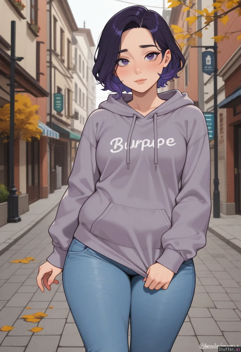 hdr, (high quality), pewbutt(artist), (KAMII MOMORU(artist), masterpiece, beautiful shading, (detailed eyes) 1girl, (attractive), adult, adult, dyed hair, dark purple hair, short hair, purple eyes, shy, (nervous), ((blush)), small breasts, looking at viewer, light confused Oversized hoodie, jeans (Chubby), fat arms, fat legs, (round face) Street, europe, autumn