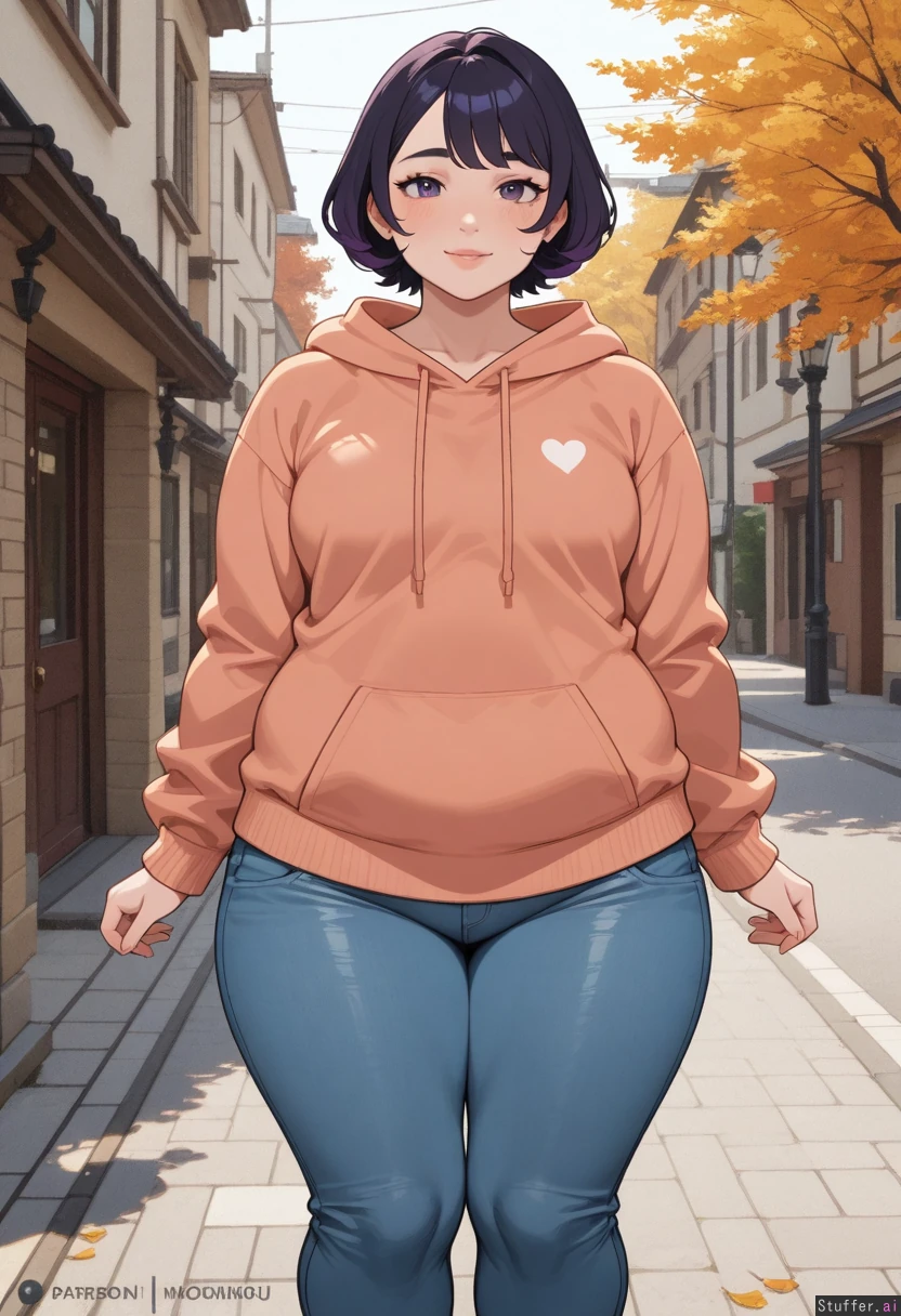 hdr, (high quality), pewbutt(artist), (KAMII MOMORU(artist), masterpiece, beautiful shading, (detailed eyes) 1girl, (attractive), adult, adult, dyed hair, dark purple hair, short hair, purple eyes, ((shy)), (nervous), ((blush)), small breasts, looking at viewer, light smile, ((hearts)) Oversized hoodie, jeans (Chubby), fat arms, fat legs, (round face) Street, europe, autumn