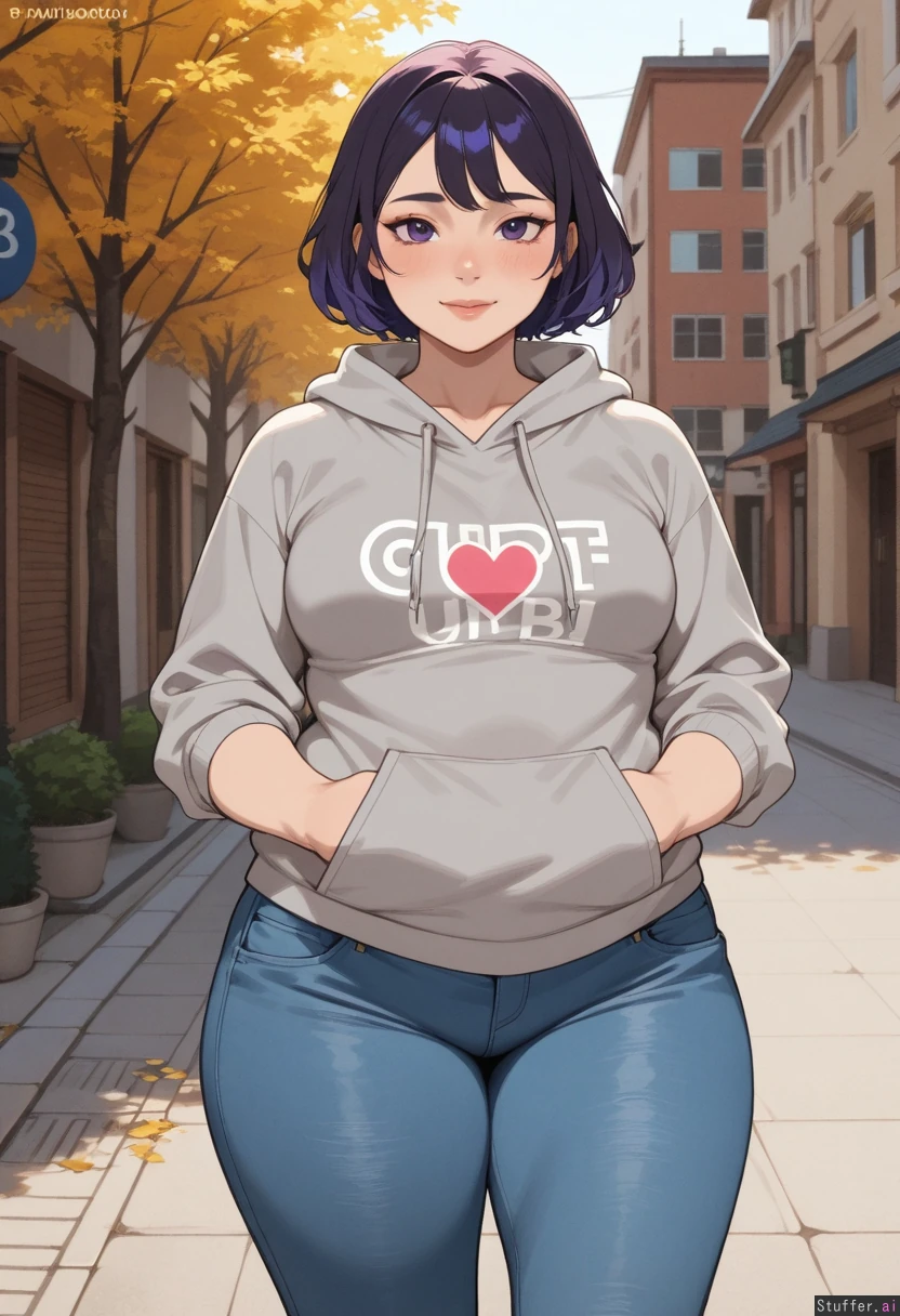 hdr, (high quality), pewbutt(artist), (KAMII MOMORU(artist), masterpiece, beautiful shading, (detailed eyes) 1girl, (attractive), adult, adult, dyed hair, dark purple hair, short hair, purple eyes, ((shy)), (nervous), ((blush)), small breasts, looking at viewer, light smile, ((hearts)) Oversized grey hoodie, jeans (Chubby), fat arms, fat legs, (round face) Street, europe, autumn
