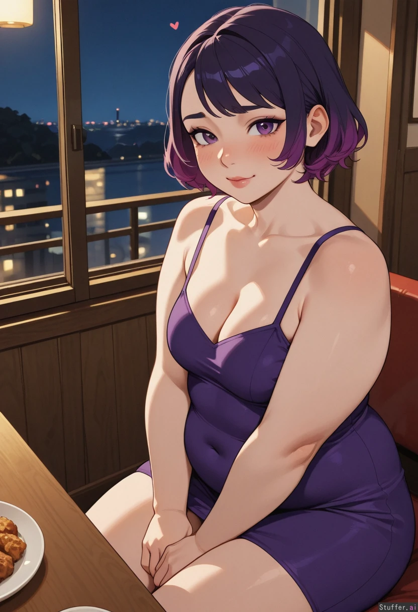 hdr, (high quality), pewbutt(artist), (KAMII MOMORU(artist), masterpiece, beautiful shading, (detailed eyes) 1girl, (attractive), adult, adult, dyed hair, dark purple hair, short hair, purple eyes, shy, (nervous), ((blush)), small breasts, looking at viewer, light smile, ((hearts)), makeup, pink lips Undersized purple dress, cleavage (Chubby), fat arms, fat legs, (round face) Restaurant, night, at table, sitting