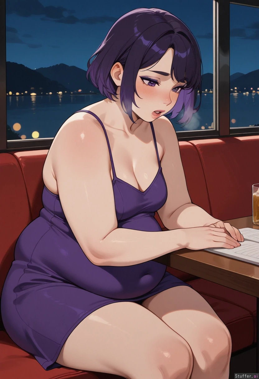 hdr, (high quality), pewbutt(artist), (KAMII MOMORU(artist), masterpiece, beautiful shading, (detailed eyes) 1girl, (attractive), adult, adult, dyed hair, dark purple hair, short hair, purple eyes, ((blush)), small breasts, makeup, pink lips, (sparkles), looking down, open mouth, heavy breath, exhausted, moaning Undersized purple dress, cleavage (Chubby), fat arms, fat legs, (round face), ((inflated belly)), ((giant belly)) Restaurant, night, at table, sitting