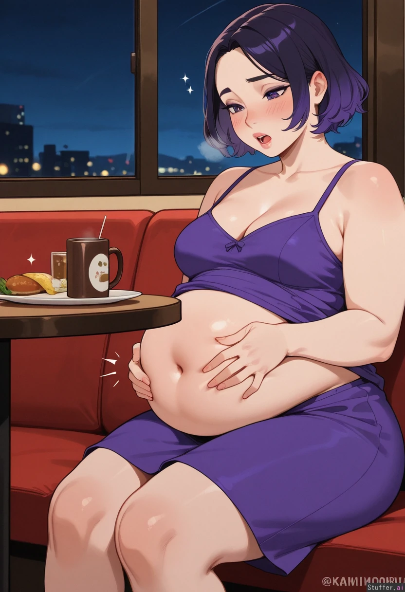 hdr, (high quality), pewbutt(artist), (KAMII MOMORU(artist), masterpiece, beautiful shading, (detailed eyes) 1girl, (attractive), adult, adult, dyed hair, dark purple hair, short hair, purple eyes, ((blush)), small breasts, makeup, pink lips, (sparkles), looking down, open mouth, heavy breath, exhausted, moaning, holding belly Undersized purple dress, cleavage (Chubby), fat arms, fat legs, (round face), ((inflated belly)), ((giant belly)) Restaurant, night, at table, sitting