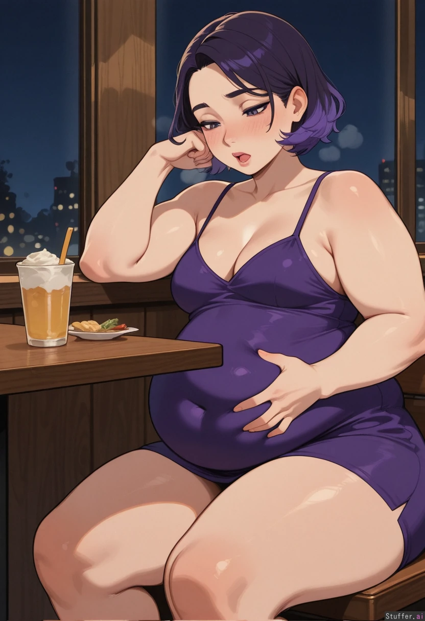 hdr, (high quality), pewbutt(artist), (KAMII MOMORU(artist), masterpiece, beautiful shading, (detailed eyes) 1girl, (attractive), adult, adult, dyed hair, dark purple hair, short hair, purple eyes, ((blush)), small breasts, makeup, pink lips, (sparkles), looking down, open mouth, heavy breath, exhausted, moaning, holding belly Undersized purple dress, cleavage (Chubby), fat arms, fat legs, (round face), ((inflated belly)), ((giant belly)) Restaurant, night, at table, sitting