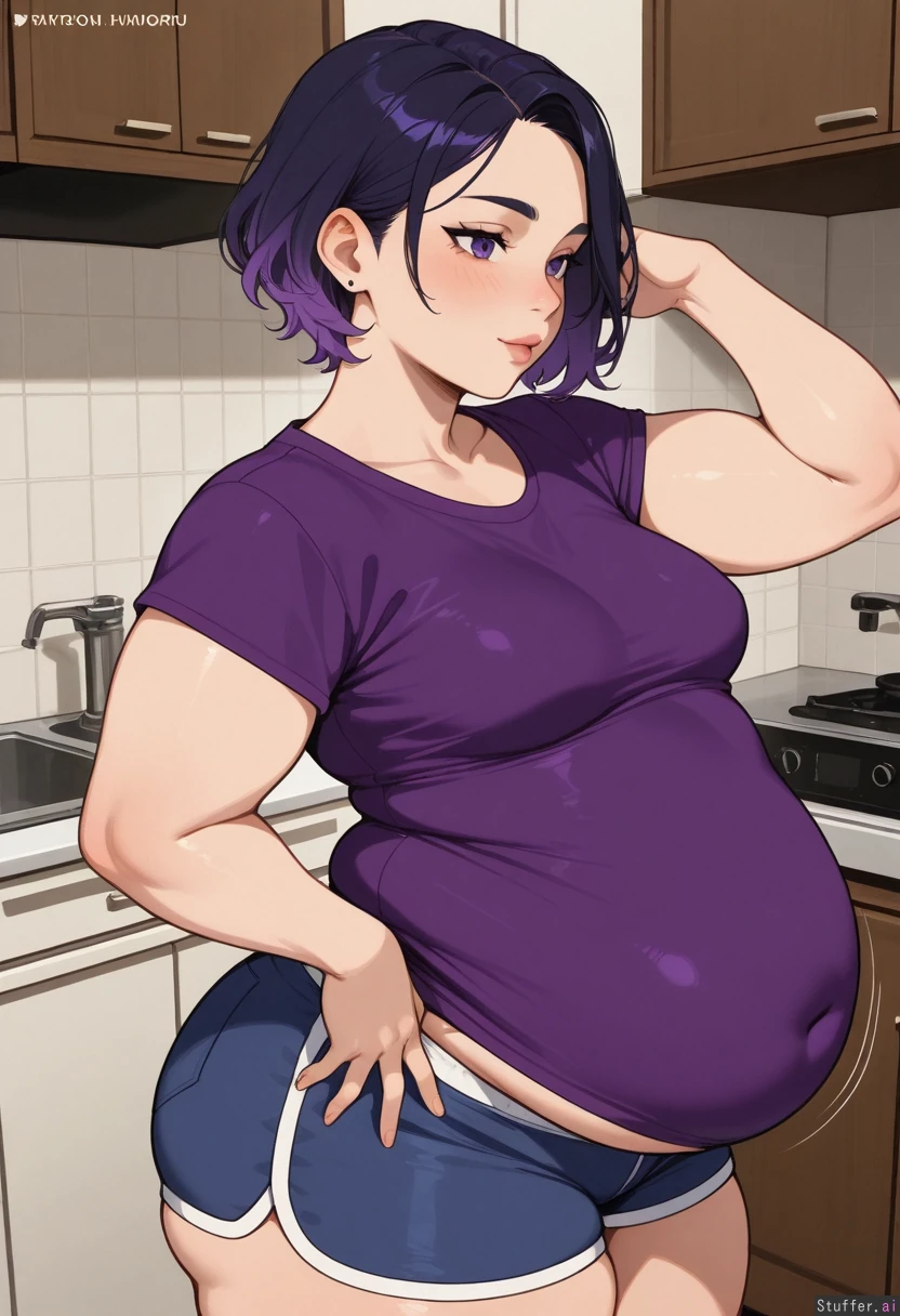 hdr, (high quality), pewbutt(artist), (KAMII MOMORU(artist), masterpiece, beautiful shading, (detailed eyes) 1girl, (attractive), adult, adult, dyed hair, dark purple hair, short hair, purple eyes, small breasts, (sparkles), ((hungry)) motion lines, side view Purple t-shirt, shorts ((Chubby)), fat arms, fat legs, (round face), (sagging belly), big belly Kitchen