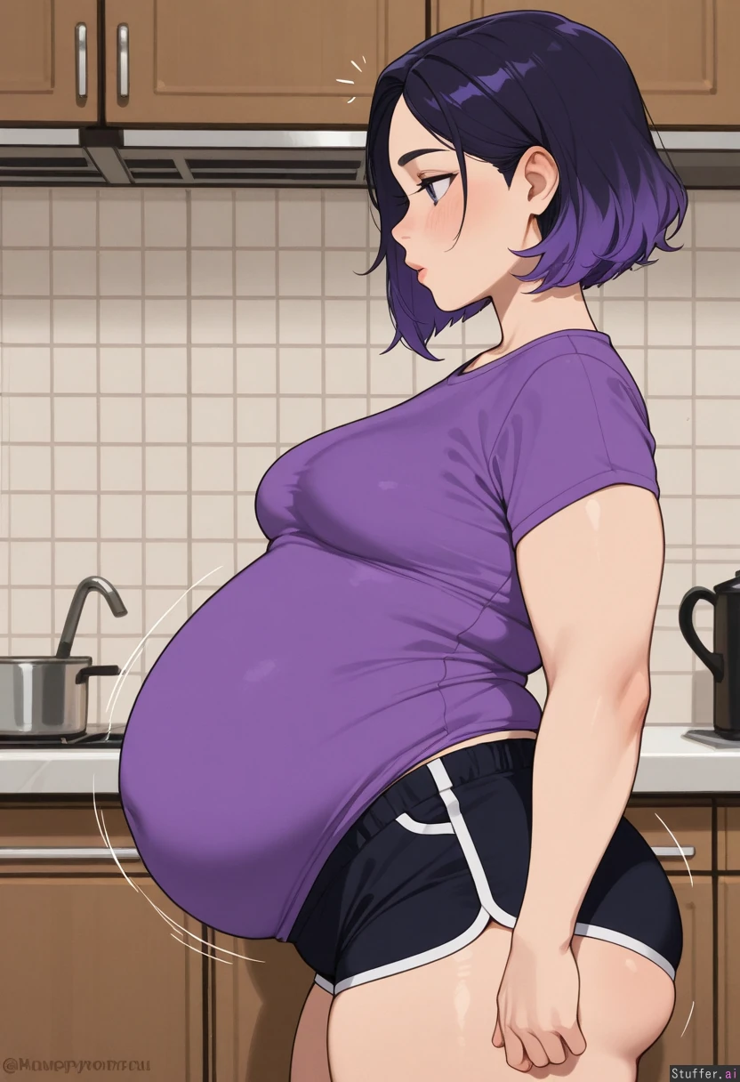 hdr, (high quality), pewbutt(artist), (KAMII MOMORU(artist), masterpiece, beautiful shading, (detailed eyes) 1girl, (attractive), adult, adult, dyed hair, dark purple hair, short hair, purple eyes, small breasts, (sparkles), ((hungry)) motion lines, side view, looking at side Purple t-shirt, shorts ((Chubby)), fat arms, fat legs, (round face), (sagging belly), big belly Kitchen