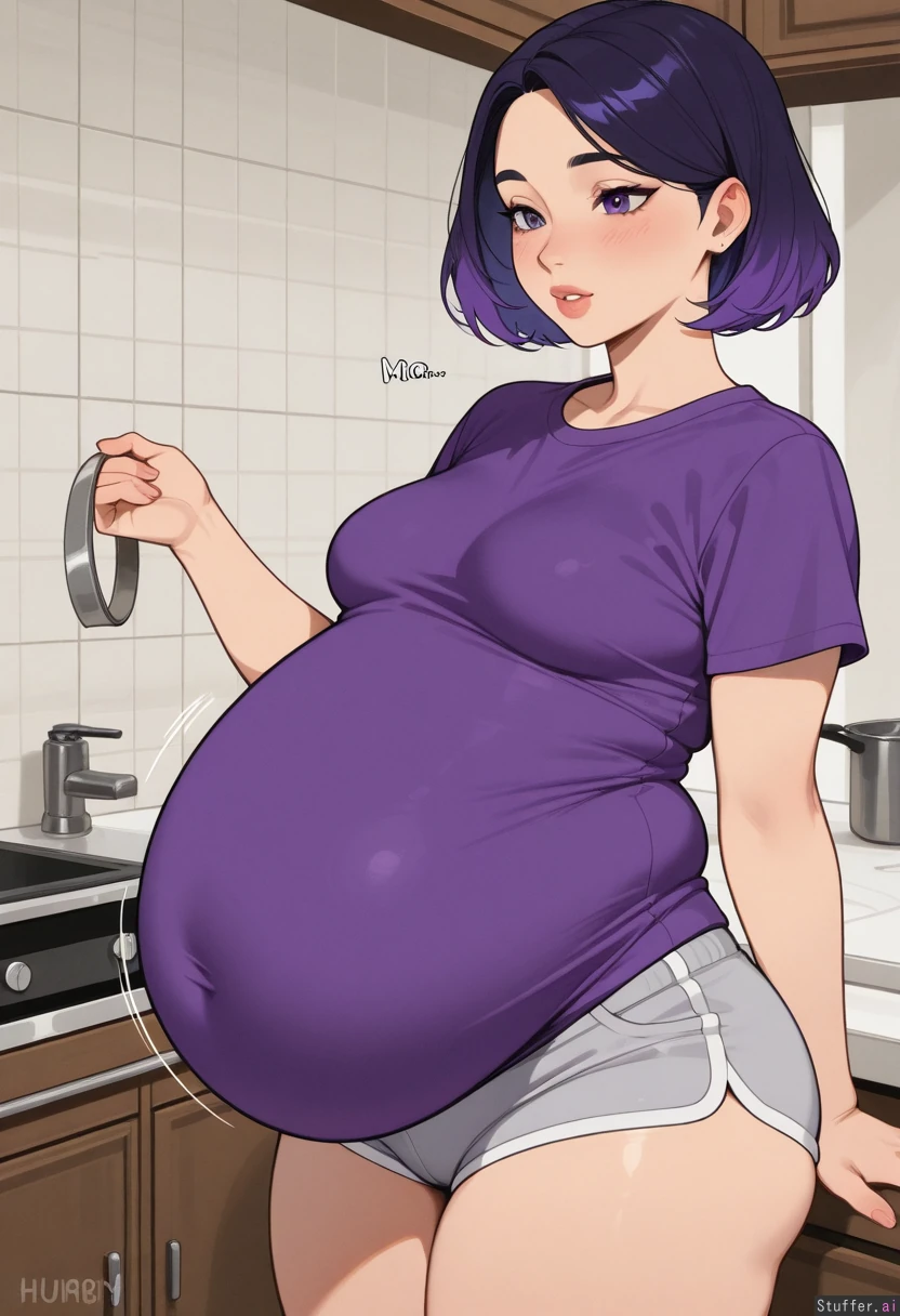 hdr, (high quality), pewbutt(artist), (KAMII MOMORU(artist), masterpiece, beautiful shading, (detailed eyes) 1girl, (attractive), adult, adult, dyed hair, dark purple hair, short hair, purple eyes, small breasts, (sparkles), ((hungry)) motion lines, looking at side Purple t-shirt, shorts ((Chubby)), fat arms, fat legs, (round face), (sagging belly), big belly Kitchen