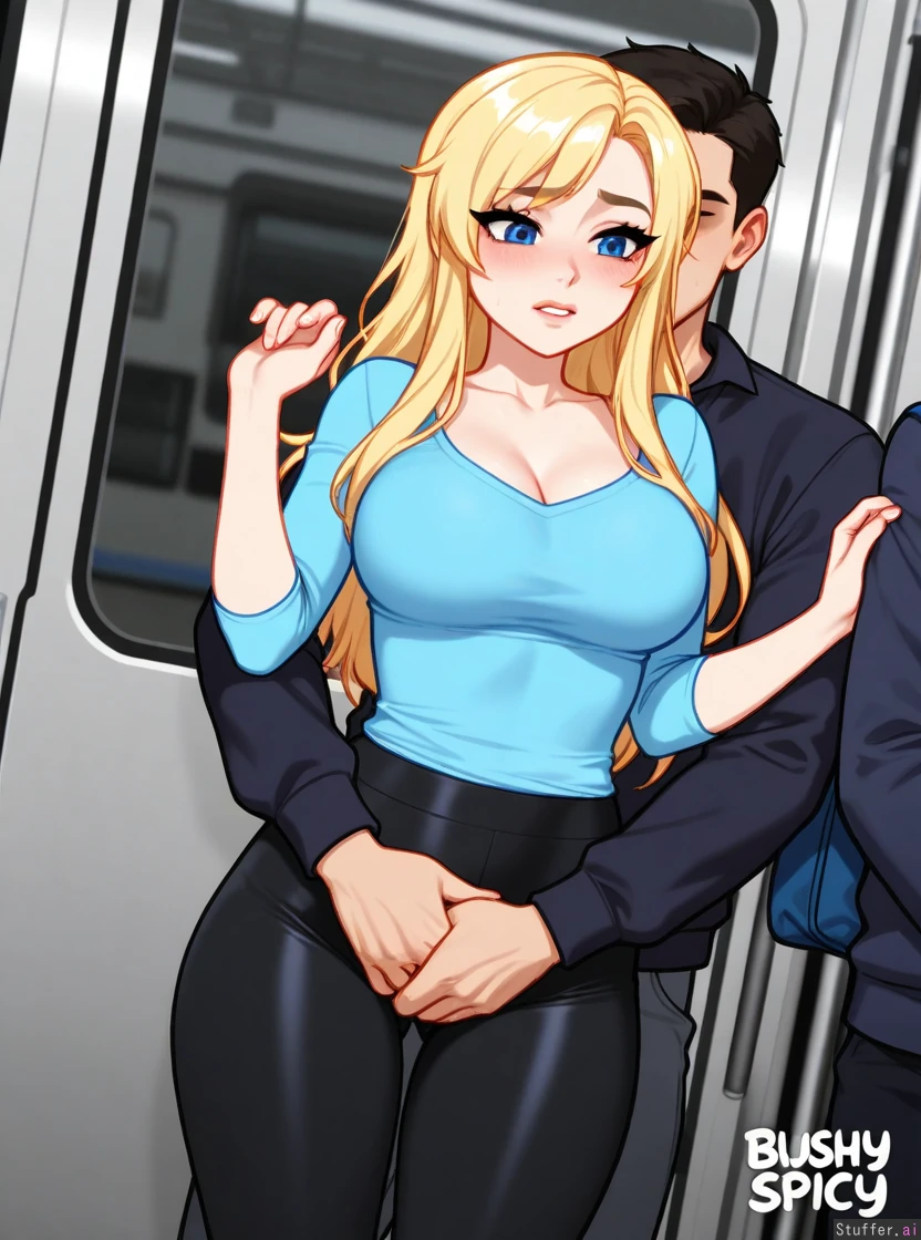 blushyspicy(artist), black leggings, blonde long hair, tight light blue shirt, train, indoors, chikan, molestation, 1girl, 1male, jerking off