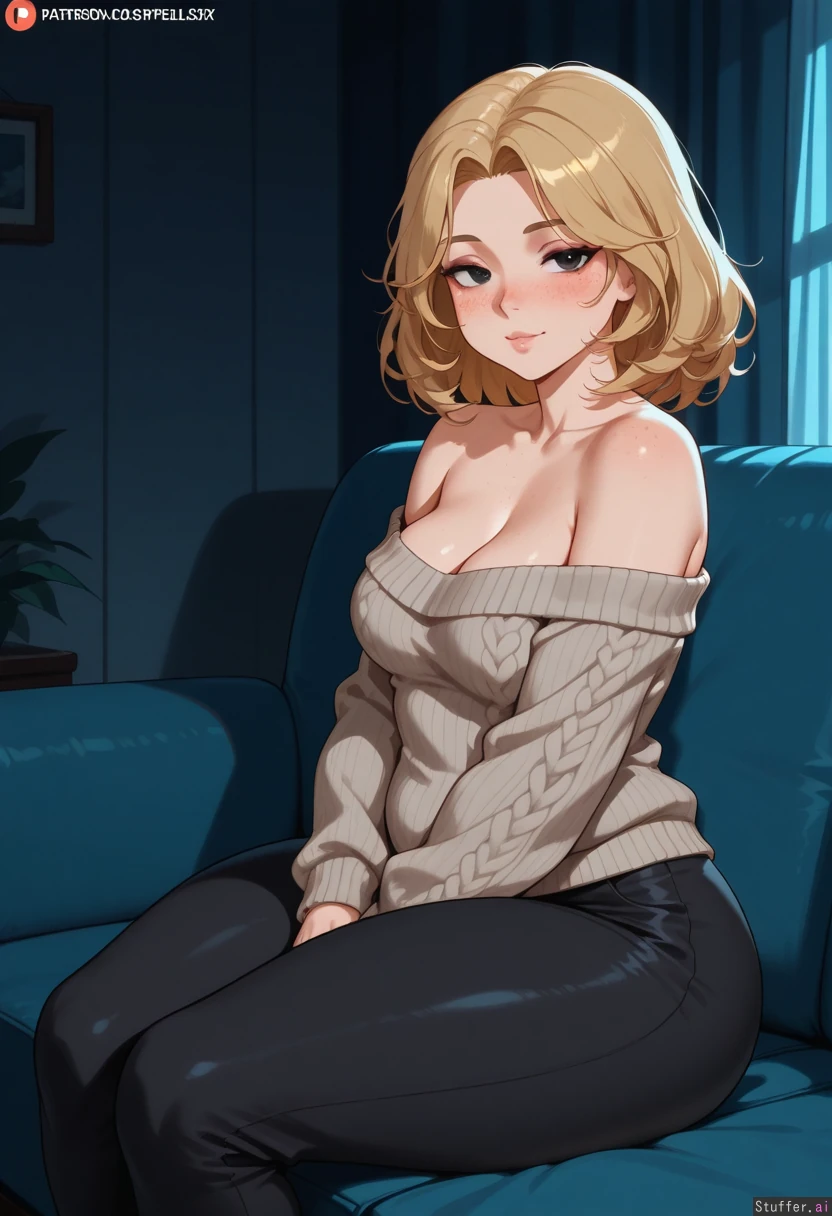 ((spellsx(artist))), (cutesexyrobutts(artist):0.6), vibrant colors, color, 1girl, (dark room), mature, Sitting on sofa, pinup, looking at viewer, (sensual smile), side view, (Grey offshoulder knit_sweater), black pants, (Blonde hair, (medium hair), melina hair, curtained hair), face, (face freckles), (body freckles), cute round black eyes, nice eyelashes, eyeshadow, ((double chin)), (Weight gain:0.0), (Thick thighs:1.2), (medium breasts), cleavage, Chubby cheeks, horny, (((blushing))), round face, low brow, bored, ((tired)), (luscious big lips),