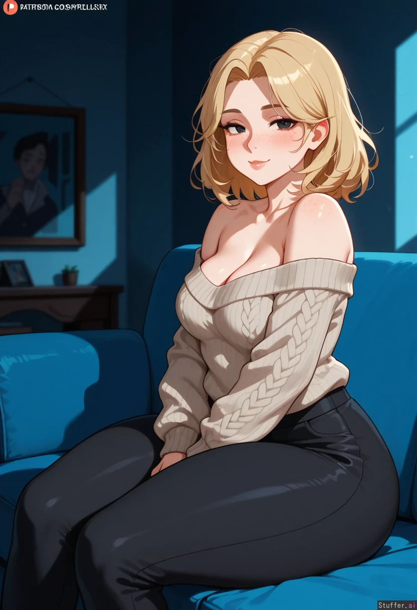 (spellsx(artist)), (cutesexyrobutts(artist):0.4), cool colors, vibrant shading, color, 1girl, (dark room), mature, Sitting on sofa, pinup, looking at viewer, (sensual smile), side view, (Grey offshoulder knit_sweater), black pants, (Blonde hair, (medium hair), melina hair, curtained hair), face, (face freckles), (body freckles), cute round black eyes, nice eyelashes, eyeshadow, ((double chin)), (Weight gain:0.0), (Thick thighs:1.2), (medium breasts), cleavage, Chubby cheeks, horny, (((blushing))), round face, low brow, bored, ((tired)), (luscious big lips),