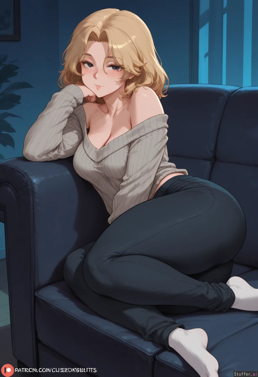 (spellsx(artist)), (cutesexyrobutts(artist)), vibrant colors, color, 1girl, (dark room), mature, Lounging on sofa, pinup, looking at viewer, (sensual smile), side view, full body, (Grey offshoulder knit_sweater), black pants, socks, (Blonde hair, (medium hair), melina hair, curtained hair), face, (face freckles), (body freckles), cute black eyes, (eyes half lidded), (eyes half closed), nice eyelashes, eyeshadow, ((double chin)), (Curvy), (thick thighs:1.2), (wide hips), (medium breasts), cleavage, Chubby cheeks, horny, (((blushing))), round face, low brow, bored, ((tired)), (luscious big lips),