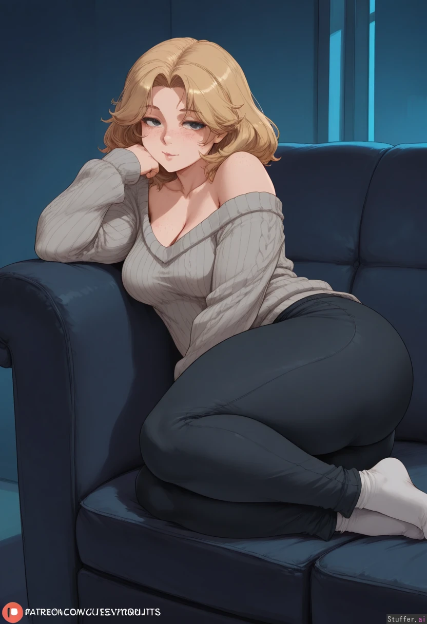 (spellsx(artist):0.6), (cutesexyrobutts(artist)), vibrant colors, color, 1girl, (dark room), mature, Lounging on sofa, pinup, looking at viewer, (sensual smile), side view, full body, (Grey offshoulder knit_sweater), black pants, socks, (Blonde hair, (medium hair), melina hair, curtained hair), face, (face freckles), (body freckles), cute black eyes, (eyes half lidded), (eyes half closed), nice eyelashes, eyeshadow, ((double chin)), (Curvy), (thick thighs:1.2), (wide fat hips), (medium breasts), cleavage, Chubby cheeks, horny, (((blushing))), round face, low brow, bored, ((tired)), (luscious big lips),