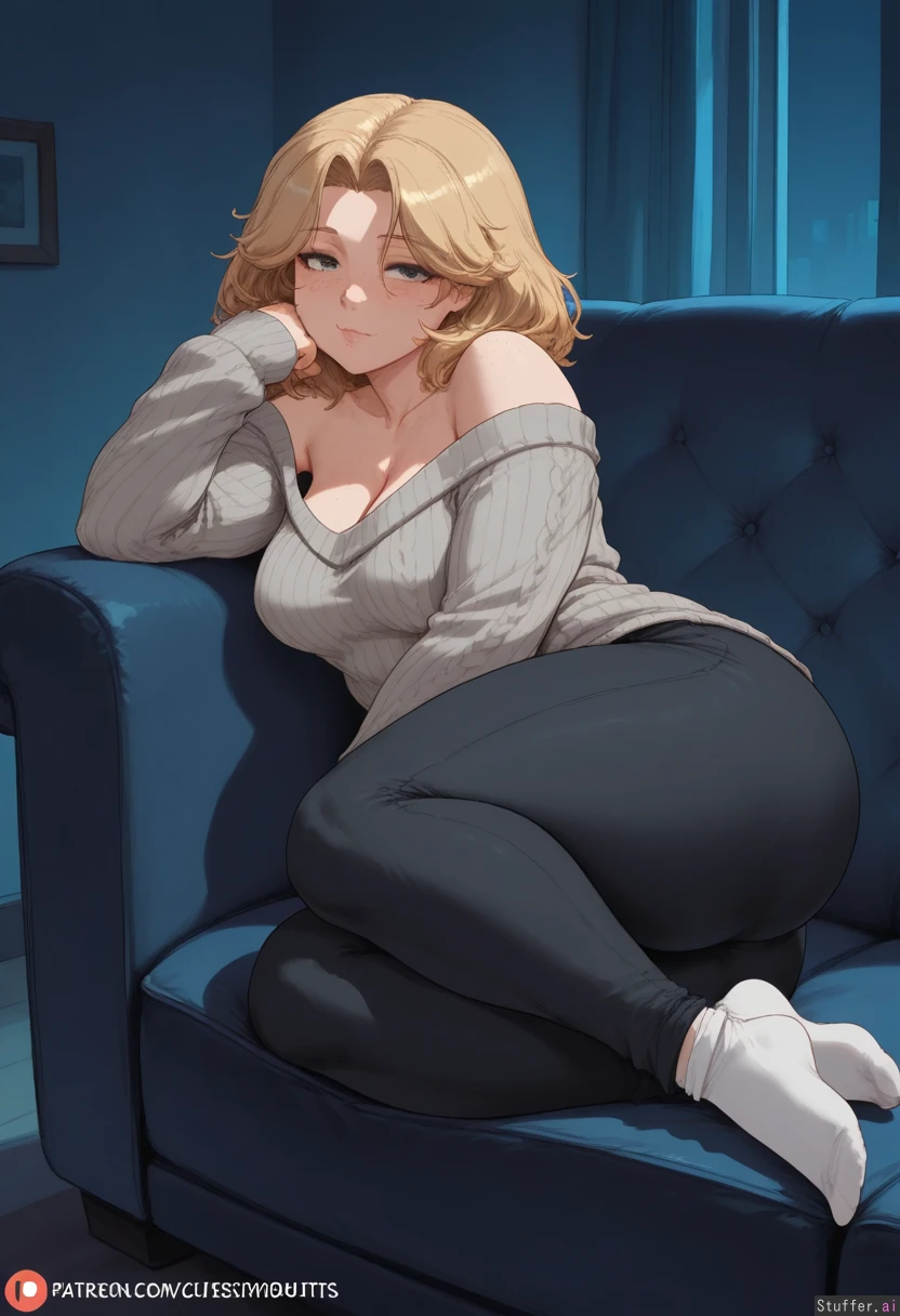 (spellsx(artist):0.6), (cutesexyrobutts(artist)), vibrant colors, color, 1girl, (dark room), mature, Lounging on sofa, legs spread, pinup, looking at viewer, (sensual smile), side view, full body, (Grey offshoulder knit_sweater), black pants, socks, (Blonde hair, (medium hair), melina hair, curtained hair), face, (face freckles), (body freckles), cute black eyes, (eyes half lidded), (eyes half closed), nice eyelashes, eyeshadow, ((double chin)), (Curvy), (thick thighs:1.2), (wide fat hips), (medium breasts), cleavage, Chubby cheeks, horny, (((blushing))), round face, low brow, bored, ((tired)), (luscious big lips),
