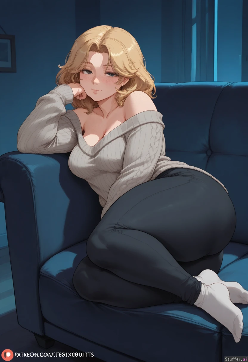 (spellsx(artist):0.6), (cutesexyrobutts(artist)), vibrant colors, color, 1girl, (dark room), mature, Lounging on sofa, legs spread open, pinup, looking at viewer, (sensual smile), side view, full body, (Grey offshoulder knit_sweater), black pants, socks, (Blonde hair, (medium hair), melina hair, curtained hair), face, (face freckles), (body freckles), cute black eyes, (eyes half lidded), (eyes half closed), nice eyelashes, eyeshadow, ((double chin)), (Curvy), (thick thighs:1.2), (wide fat hips), (medium breasts), cleavage, Chubby cheeks, horny, (((blushing))), round face, low brow, bored, ((tired)), (luscious big lips),