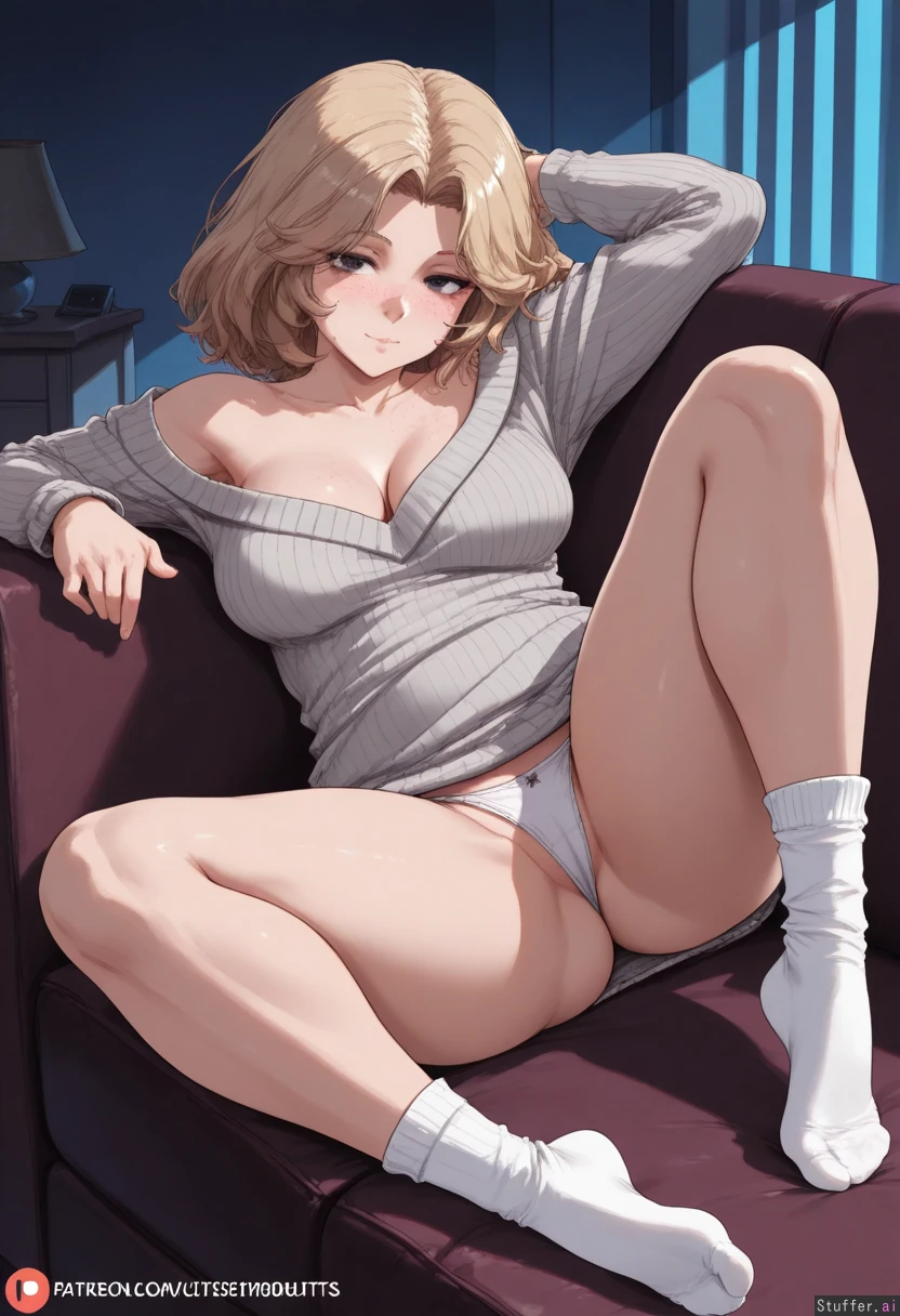 (spellsx(artist):0.6), (cutesexyrobutts(artist)), vibrant colors, color, 1girl, (dark room), mature, Sitting back on sofa, legs spread open, pinup, looking at viewer, (sensual smile), side view, full body, (Grey offshoulder knit_sweater), black unbuttoned pants, white panties, white socks, (Blonde hair, (medium hair), melina hair, curtained hair), face, (face freckles), (body freckles), cute black eyes, (eyes half lidded), (eyes half closed), nice eyelashes, eyeshadow, ((double chin)), (Curvy), (thick thighs:1.2), (wide fat hips), (medium breasts), cleavage, Chubby cheeks, horny, (((blushing))), round face, low brow, bored, ((tired)), (luscious big lips),