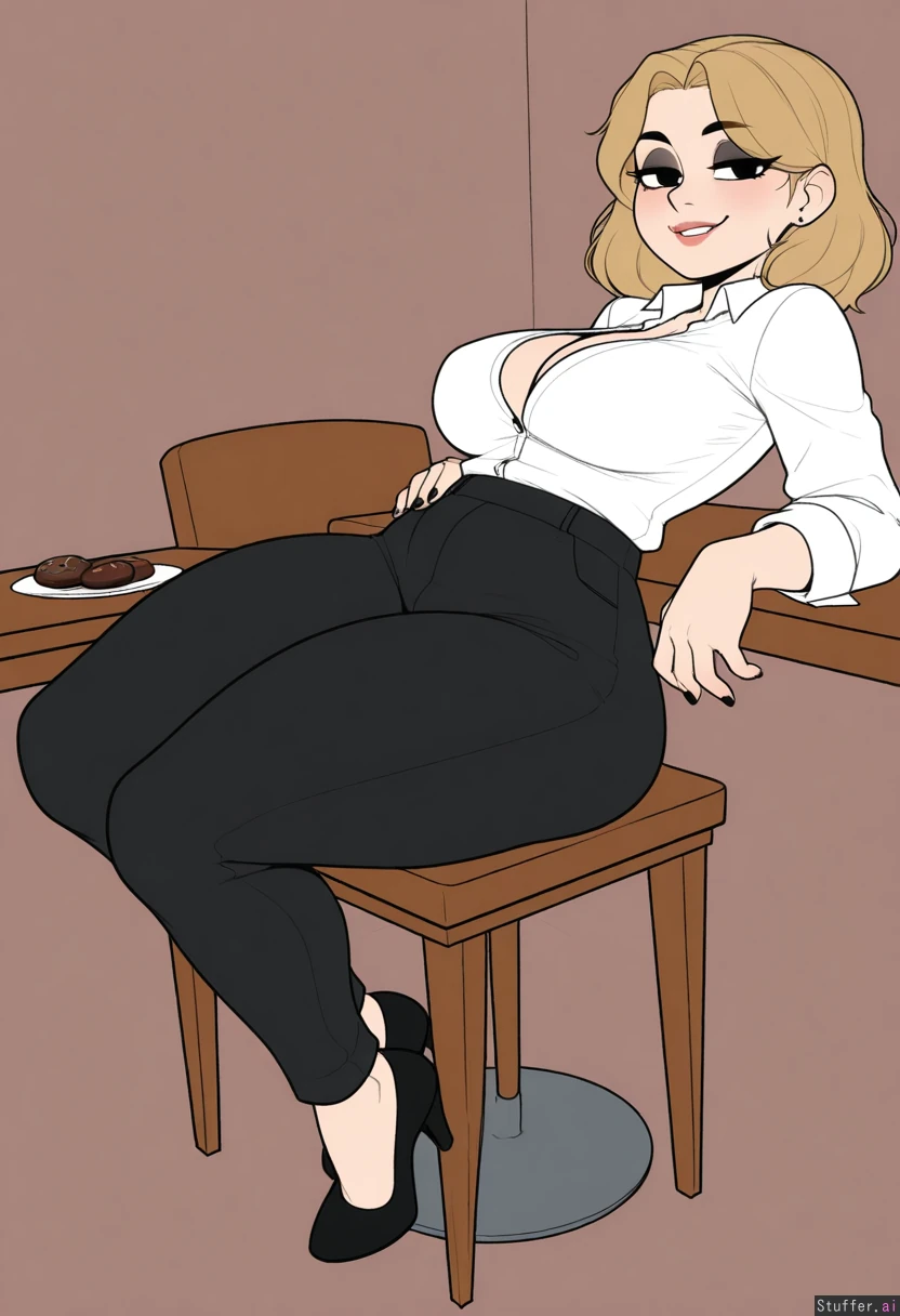 high quality, (masterpiece), (flat colors), vanripper(artist), pudgeruffian(artist), krekkov(artist), Office lady, (fair skin), (blonde hair, curtained bangs, medium hair, melina hair), fang, (eyes half-lidded), beautiful black eyes, nice eyelashes, dark eyeshadow, eyeliner, black nails, round face, (luscious big lips:1.1), (White button shirt), black pants, black heels, (curvy), (wide hips), ((thick thighs)), (medium perky breasts), cleavage, (Lounging on wooden chair), leaning back, (next to table), (plate of chocolate donuts on table), (neutral background), from side, perspective, (Obese:0.0), (chubby cheeks:0.75), ((Slightly bloated belly:0.00)), ((Bloated:0.00)), ((Burping:0.0)), ((Donut_in_mouth:0.0)), ((Arm resting on table)), ((Rubbing_belly:0.0)), ((Smug smile:1.00)), ((Voluptuous)), ((Belly hang:0.0)),