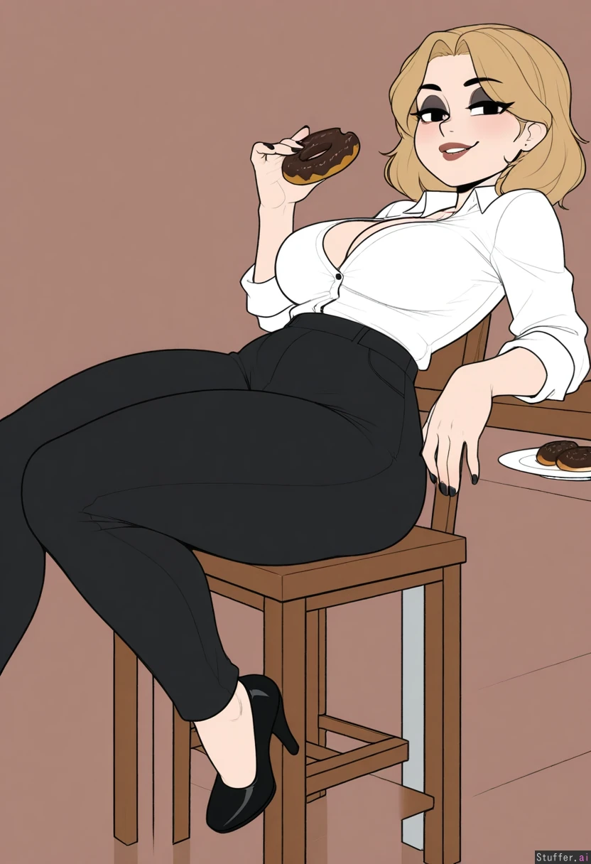 high quality, (masterpiece), (flat colors), vanripper(artist), pudgeruffian(artist), krekkov(artist), Office lady, (fair skin), (blonde hair, curtained bangs, medium hair, melina hair), fang, (eyes half-lidded), beautiful black eyes, nice eyelashes, dark eyeshadow, eyeliner, black nails, round face, (luscious big lips:1.1), (White button shirt), black pants, black heels, (curvy), (wide hips), ((thick thighs)), (medium perky breasts), cleavage, (Lounging on wooden chair), leaning back, (next to table), (plate of chocolate donuts on table), (neutral background), from side, perspective, (Obese:0.0), (chubby cheeks:0.75), ((Slightly bloated belly:0.00)), ((Bloated:0.00)), ((Holding Donut_in_mouth:1.0)), ((Arm resting on table)), ((Rubbing_belly:0.0)), ((Smug smile:1.00)), ((Voluptuous)), ((Belly hang:0.0)),