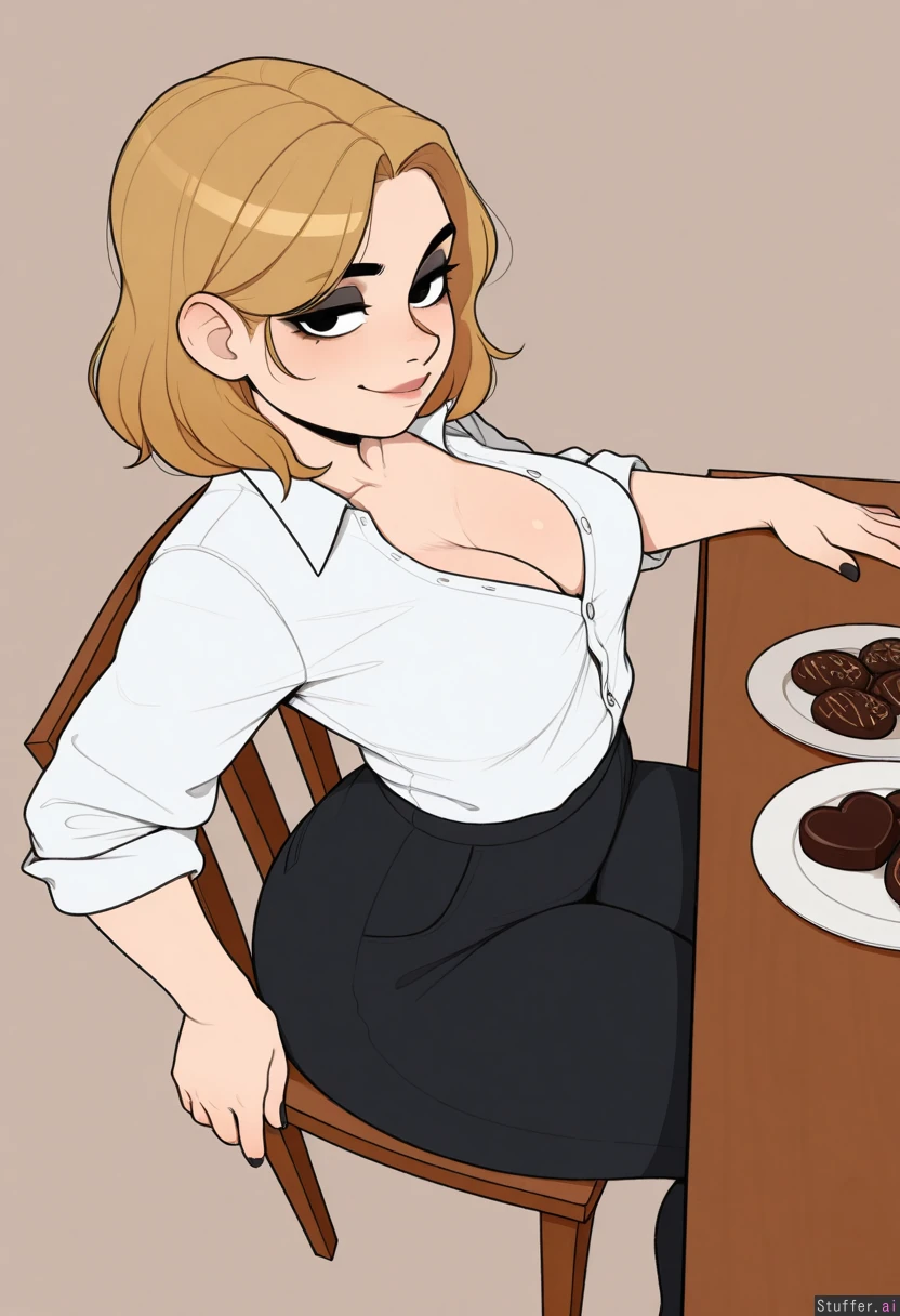 high quality, (masterpiece), (flat colors), vanripper(artist), pudgeruffian(artist), krekkov(artist), Office lady, (fair skin), (blonde hair, curtained bangs, medium hair, melina hair), (eyes half-lidded), beautiful black eyes, nice eyelashes, dark eyeshadow, eyeliner, black nails, (luscious big lips:1.1), (White button shirt), black pants, (curvy), (wide hips), ((thick thighs)), (medium perky breasts), cleavage, (Lounging on wooden chair), leaning back, (next to table), (plate of chocolate donuts on table), (neutral background), from side, perspective, (Obese:0.0), (chubby cheeks:0.75), ((Slightly bloated belly:0.00)), ((Bloated:0.00)), ((Holding Donut_in_mouth:0.0)), ((Arm resting on table)), ((Rubbing_belly:0.0)), ((Smug smile:1.00)), ((Voluptuous)), ((Belly hang:0.0)),