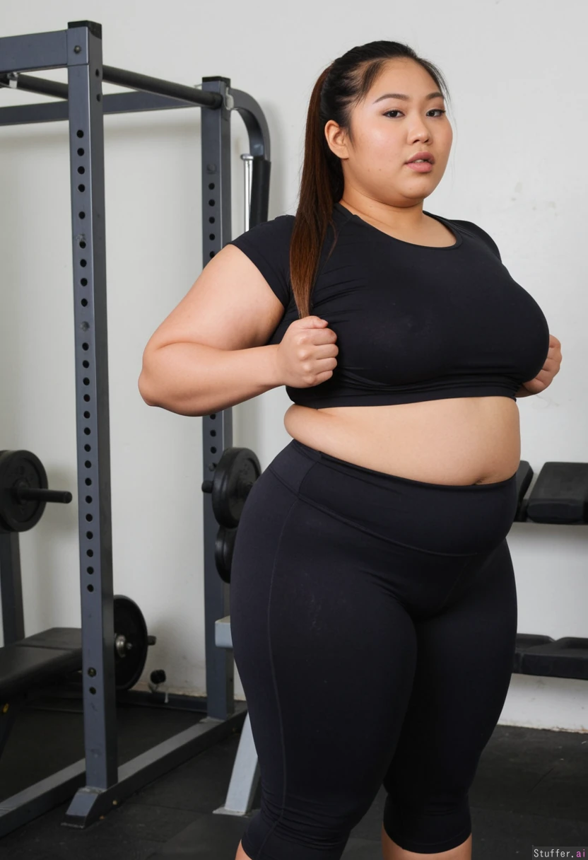 Asian in black fitness clothes, shirt ,Thick, wide ((Thick)) Fat Filipina