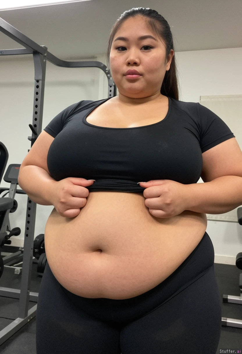 Asian in black fitness clothes, shirt ,Thick, wide ((Thick)) ((Fat)) Filipina Large chest