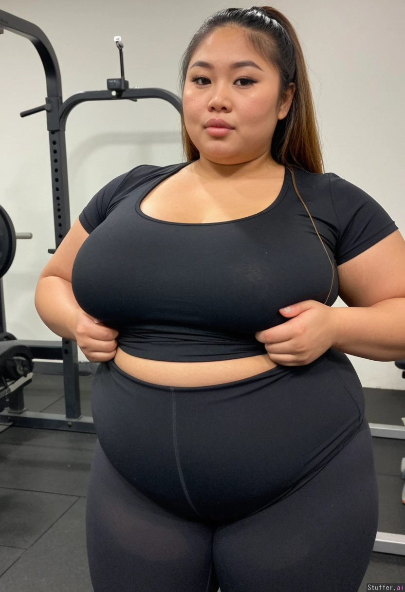 Asian in black fitness clothes, tight shirt ,Thick, wide ((Thick)) ((Fat)) Filipina (Large chest)
