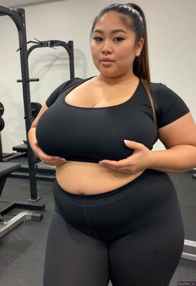 Asian in black fitness clothes, tight shirt ,Thick, wide ((Thick)) ((Fat)) Filipina (Curvy) (Large chest)