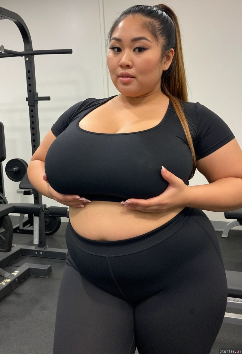 Asian in black fitness clothes, tight shirt ,Thick, wide (((Thick))) ((Fat)) Filipina (Curvy) (Large chest)