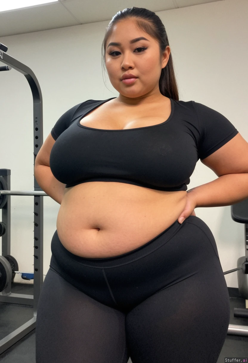 Asian in black fitness clothes, tight shirt ,Thick, wide ((((Thick)))) ((((Fat)))) Filipina ((Curvy)) (Large chest) Tight body