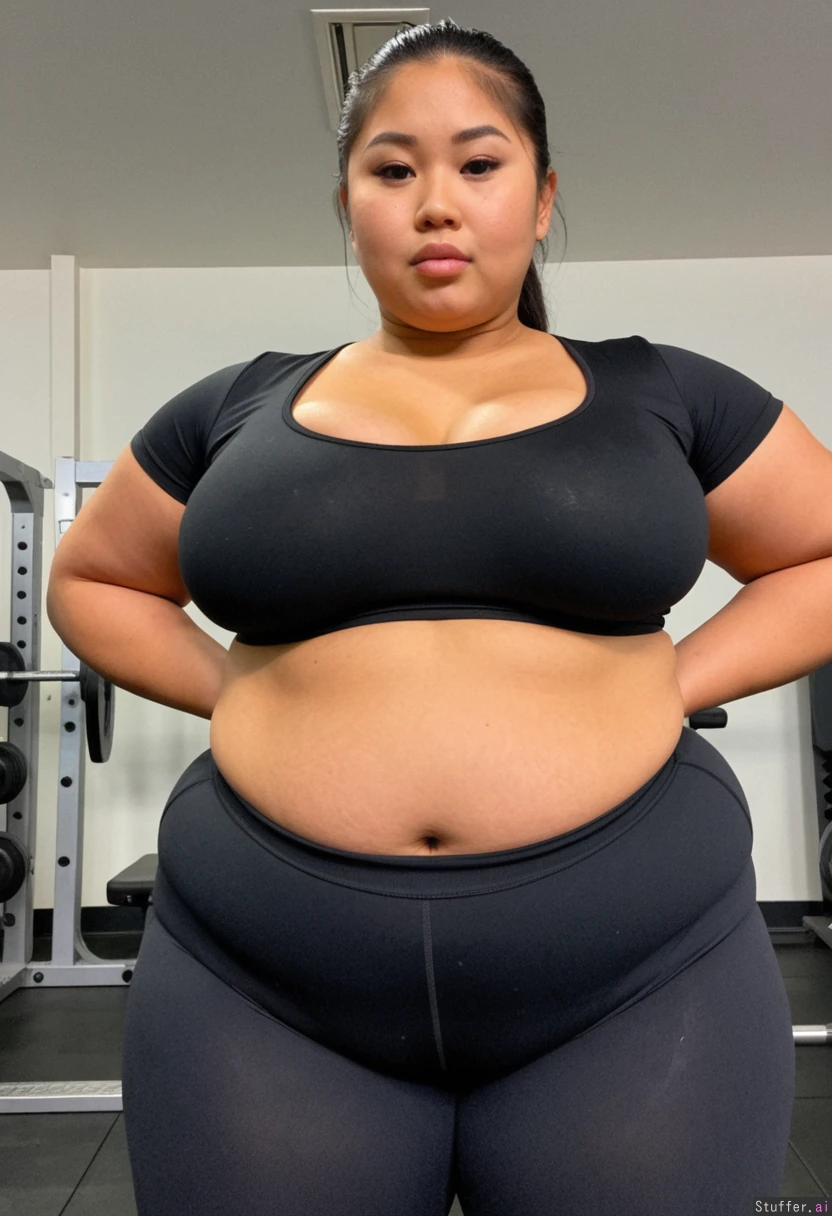 Asian in black fitness clothes, tight shirt ,Thick, wide ((((Thick)))) ((((Fat)))) Filipina ((Large chest)) Tight body