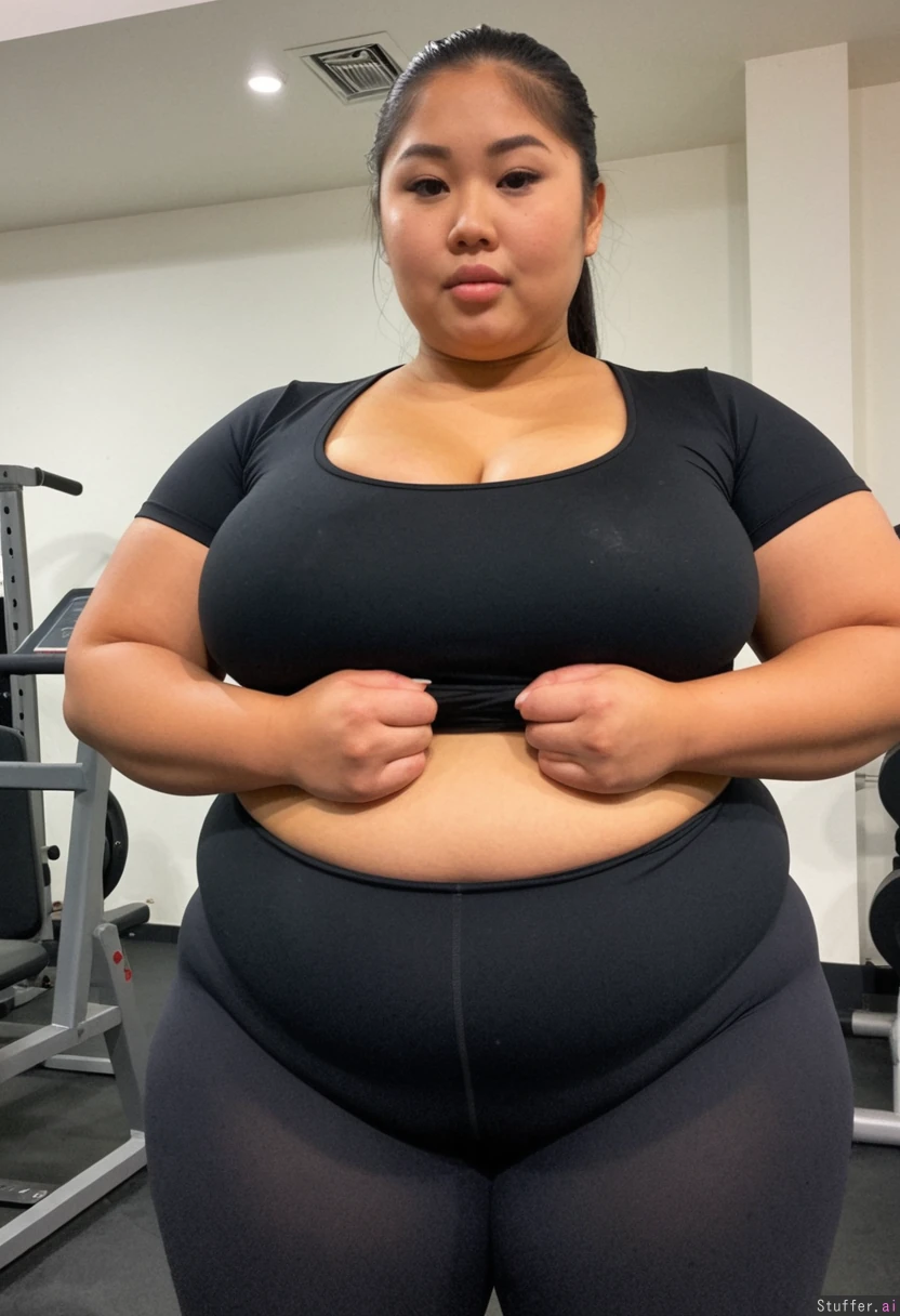 Asian in black fitness clothes, tight shirt ,Thick, wide ((((Thick)))) ((((Fat)))) Filipina Pretty ((Large chest)) Tight body