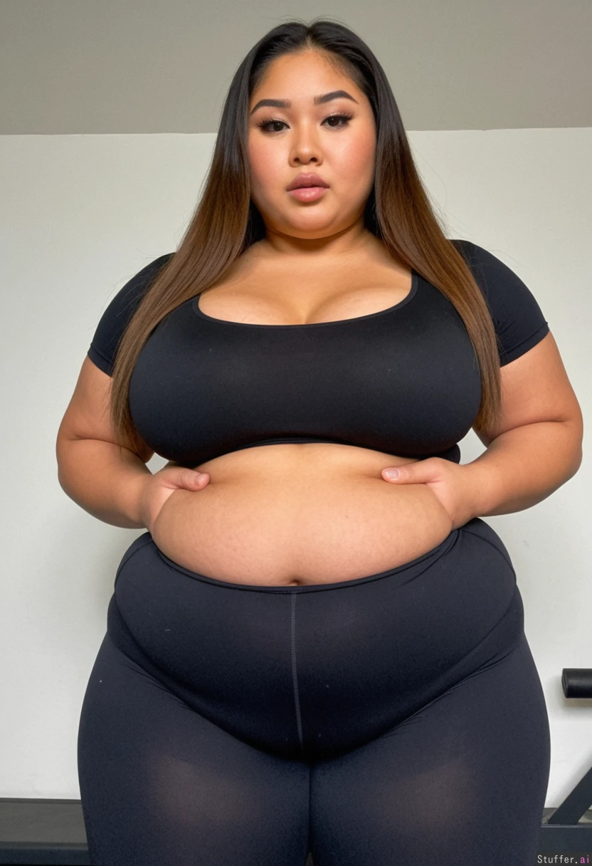 Asian in black fitness clothes, tight shirt ,Thick, wide ((((Thick)))) ((((Fat)))) Filipina Soft hair, soft body ((Large chest)) Tight body Curvy Chunky