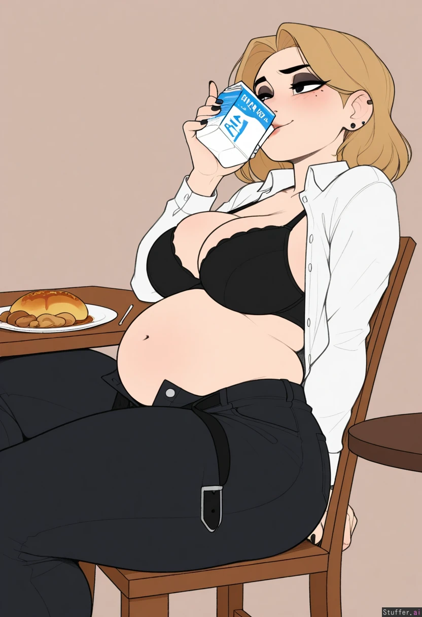 high quality, (masterpiece), ((flat colors)), vanripper(artist), pudgeruffian(artist), krekkov(artist), (spells(artist)), (fair skin), (blonde hair, curtained hair, medium hair, melina hair), (eyes half closed), beautiful black eyes, nice eyelashes, dark eyeshadow, eyeliner, black nails, (luscious big lips:1.1), (White button_shirt jacket), black pants, unzipped pants, black bra, no glasses, undone belt, (curvy), ((wide hips)), ((thick thighs)), (medium perky breasts), bursting breasts, cleavage, (Lounging on wooden chair), leaning back, (next to table), (plate of donuts on table), (neutral background), side view, (Obese:0.0), (chubby cheeks:1.0), ((Slightly bloated belly:1.10)), ((Bloated:1.10)), (Milk carton in hand, holding to mouth, Drinking milk carton), head back, looking up, ((Arm resting on table:0.0)), ((Rubbing_belly:0.0)), ((Smug expression:1.00)), (furrowed brow), ((Voluptuous)), ((Belly hang:0.0)),