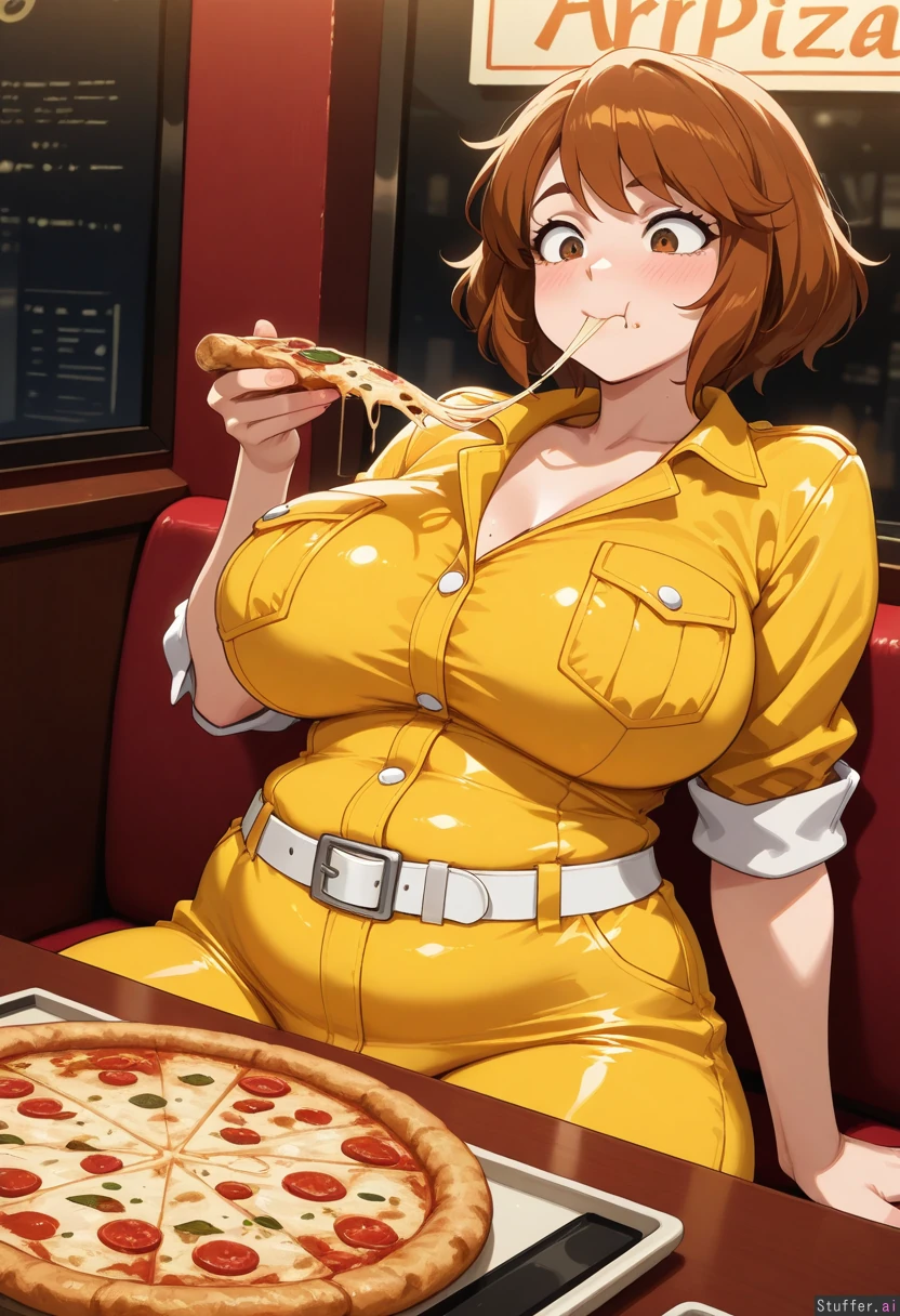 (High quality, ultra high definition, 8k, masterpiece, incredible shading and lighting) 1 female, solo, (april o'neil), (wearing yellow jumpsuit with white belt), (morbidly obese:.0), (gigantic belly:.9), (fully clothed, white belt unbuckled, buttons very tight on clothes), large breasts, wide waist, (belly on top of table), (front view, view of upper body only) (In pizza restaurant, sitting in booth in front of table, eating pizza, blushing, excited)